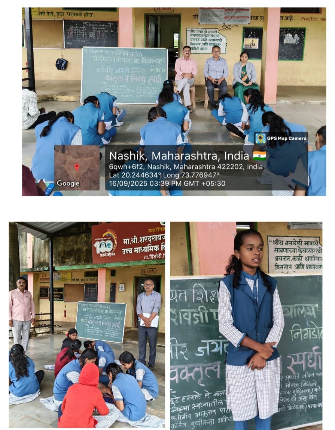 निगडोळ:-(प्रतिनिधी ) रयत शिक्षण संस्थेचे मा.शरदरावजी पवार माध्य.विद्यालय निगडोळ ता.दिंडोरी जि.नाशिक या विद्यालयात थोर शिक्षण महर्षी कर्मवीर भाऊराव पाटील उर्फ आण्णांच्या जयंती महोत्सव सप्ताहचे औचित्य साधून विद्यालयाचे मा.मुख्याध्यापक बोरसे डी.डी.यांच्या मार्गदर्शनानुसार जेष्ठ शिक्षक एन.जे. कापडणीस व श्रीमती.गायकवाड पी.व्ही.यांनी वक्तृत्व,निबंध,मेहंदी व चित्रकला स्पर्धांचे नियोजन केले इ.८वी ते १० वी च्या विद्यार्थ्यांनी या स्पर्धांमध्ये उत्फुर्तपणे भाग घेतला.जेष्ठ शिक्षक एस.व्ही.बेद्रे व ए.बी.वाघमारे यांनी परीक्षक म्हणून काम पाहिले.मा.मुख्याध्यापक बोरसे डी.डी.यांनी प्रथम,द्वितीय व तृतीय आलेल्या विद्यार्थ्यांचे कौतुक व अभिनंदन केले. स्पर्धा उपक्रमांच्या यशस्वीतेसाठी देवरे व्ही.ए व भामरे टी.व्ही.यांनी अनमोल सहकार्य केले.