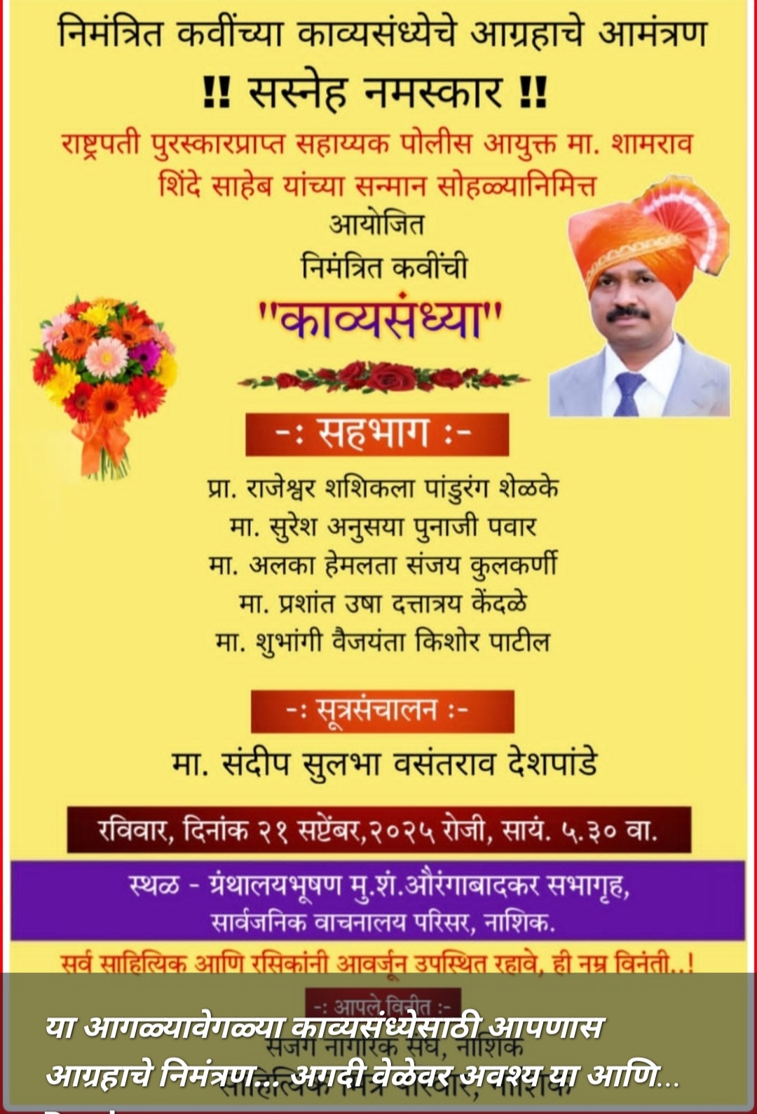 नाशिक:- भगूरचे भूमिपुत्र आणि राष्ट्रपती पुरस्कारप्राप्त मुंबईच्या गुन्हे शाखेचे सहाय्यक पोलीस आयुक्त शामराव शिंदे यांच्या सन्मान सोहळ्यानिमित्त रविवार (दि.२१) रोजी निमंत्रित कवींची “काव्यसंध्या” रंगणार आहे. सावानाच्या ग्रंथालयभूषण मु.शं.औरंगाबादकर सभागृहात सायंकाळी ५.३० वाजता होणाऱ्या या काव्यसंध्येत गझलकार प्रा.राजेश्वर शशिकला पांडुरंग शेळके, गिरणा गौरव प्रतिष्ठानचे संस्थापक अध्यक्ष सुरेश अनुसया पुनाजी पवार, ज्येष्ठ कवयित्री अलका हेमलता संजय कुलकर्णी, युवाकवी प्रशांत उषा दत्तात्रय केंदळे, गोड गळ्याच्या कवयित्री शुभांगी वैजयंता किशोर पाटील हे निमंत्रित कवी सहभागी होणार आहे. सूत्रसंचालन सुप्रसिद्ध निवेदक संदीप सुलभा वसंतराव देशपांडे करणार आहेत. नाशिककर साहित्यिक आणि रसिकांनी उपस्थित राहण्याचे आवाहन सजग नागरिक संघाचे अध्यक्ष संजय करंजकर, सावानाचे सहाय्यक सचिव प्रा.सोमनाथ मुठाळ, नाट्यगृह सचिव गणेश बर्वे, परिवहन अधिकारी उत्तमराव जाधव, ज्येष्ठ कामगार नेते प्रशांत कापसे, ज्येष्ठ उद्योजक अविनाश कातकाडे, सुप्रसिद्ध विनोदी साहित्यिक संदीप देशपांडे, कवी रवींद्र मालुंजकर आणि साहित्यिक मित्रपरिवाराने केले आहे.
