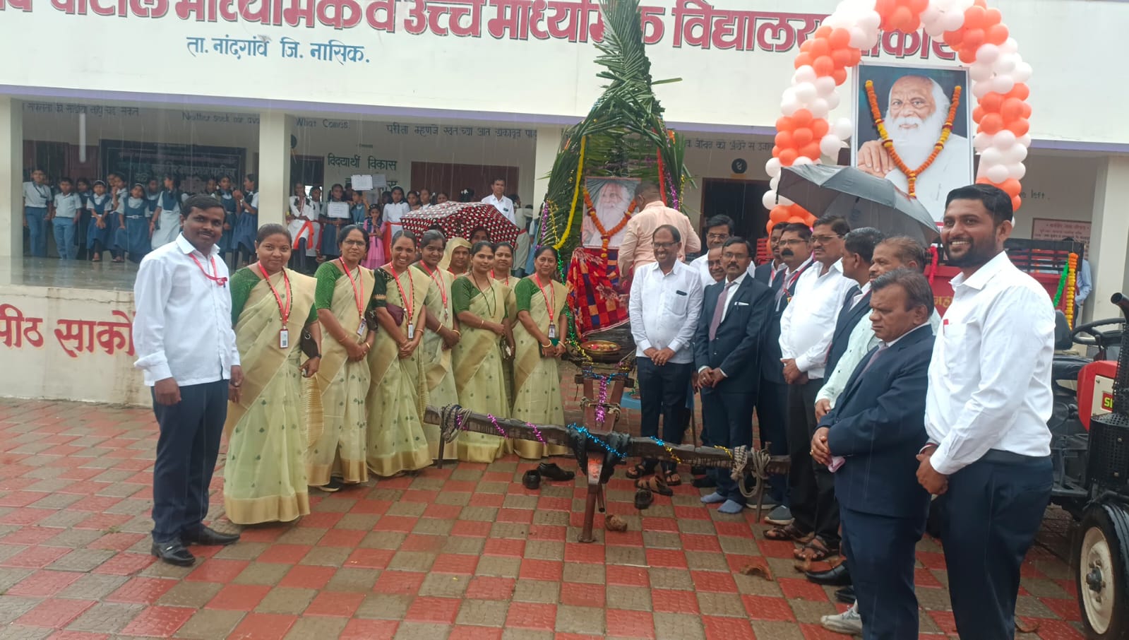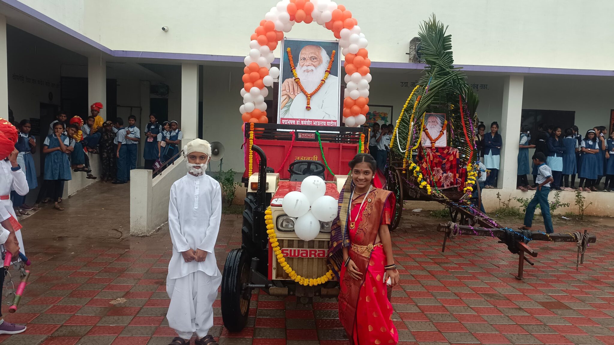 विद्यालयाचे स्कूल कमिटीचे चेअरमन श्री रमेश उग्रसेन बोरसे, प्राचार्य श्री झाल्टे डी. एस., स्कूल कमिटीचे सदस्य, विद्यालयाचा सर्व स्टाफ, ग्रामस्थ व पालक यांच्या हस्ते कर्मवीर भाऊराव पाटील यांच्या प्रतिमेस पुष्पहार अर्पण करण्यात आले. जयंतीनिमित्त विद्यालयातील विद्यार्थ्यांनी बँड पथकाच्या तालावर मिरवणुकीत गरबा नृत्य, लेझीम नृत्य सादर केले. तसेच ‘मोबाईल मुळे मुलांचे हरवले बालपण’ या विषयावरील नाटिका, विविध वेशभूषा धारण करून विविध समाजाची व समाजसुधारकांची ओळख विद्यार्थ्यांनी मिरवणुकीत करून दिली. मिरवणुकी दरम्यान पावसाचे आगमन झाल्याने देखील विद्यार्थ्यांनी मोठ्या उत्साहात घोषणा देत मिरवणुकीत आनंदाने सहभाग घेतला.