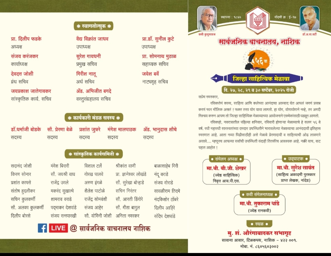 नाशिक (प्रतिनिधी ) १८५ वर्षांची परंपरा असलेल्या सार्वजनिक वाचनालय,नाशिक या संस्थेचा ५६ वा *जिल्हा साहित्य मेळावा* २७ व २८ सप्टेंबर २०२५ ला आयोजित करण्यात आला आहे, यामध्ये कवी संमेलन, परिसंवाद, लेखकांची मुलाखत, पुरस्कार वितरण असे भरगच्च कार्यक्रम आहे, आपण आवर्जून उपस्थित राहावे व सहभागी व्हावे.