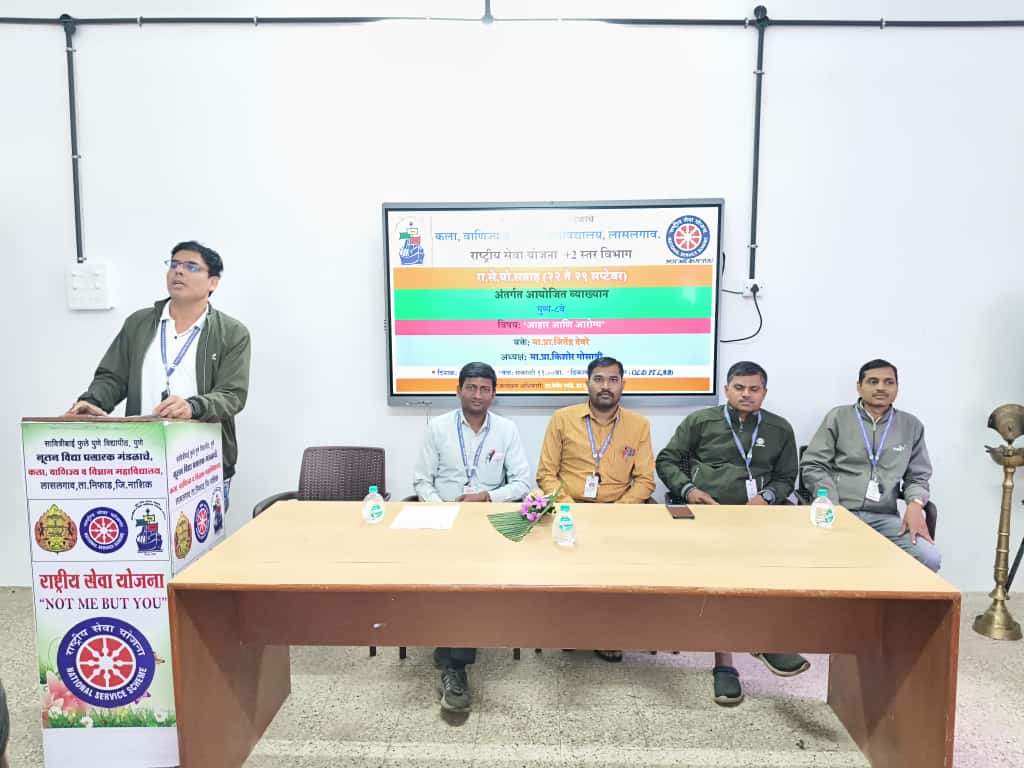 कार्यक्रमास वक्ते म्हणून लाभलेले प्रा.उज्वल शेलार यांनी शहीद भगतसिंग यांच्या जीवन कार्याविषयी मनोगत व्यक्त करतांना सांगितले की शहीद भगतसिंग यांचे जीवन कार्य तरुणांना प्रेरणा व मार्गदर्शन देणारे आहे. त्यांनी आपल्या जीवनामध्ये वाचनाला त्याचबरोबर देशसेवेला जे महत्त्व दिलं त्यातून प्रेरणा घेऊन आपणही आपल्या देशाची सेवा करण्यास सज्ज असले पाहिजे असे सांगितले. कार्यक्रमास लाभलेले दुसरे वक्ते प्रा.जितेंद्र देवरे यांनी स्वयंसेवकांना ‘आरोग्य व आहार’ याविषयी मार्गदर्शन करतांना आरोग्य चांगले ठेवण्यासाठी संतुलित आहार घेणे, नियमित व्यायाम करणे, पुरेशी झोप घेणे, तणाव कमी करणे, स्वच्छता पाळणे आणि नियमित वैद्यकीय तपासण्या करणे महत्त्वाचे आहे असे प्रतिपादन केले. यावेळी मंचावर प्रा.महेश होळकर, प्रा.रामनाथ कदम, प्रा.दत्तात्रय गायकवाड, प्रा.नितीन शिंदे, रा.से.यो. कार्यक्रमाधिकारी प्रा.देवेंद्र भांडे व प्रा.सुनिल गायकर उपस्थित होते. कार्यक्रमाचे सुत्रसंचालन कु.अर्चना आव्हाड आणि धनश्री राजोळे या विद्यार्थिनींनी केले, प्रास्ताविक कु.श्रेया सूर्यवंशी आणि सिद्धी कदम यांनी केले, वक्ता परिचय कु.यज्ञेश जेउघाले व सार्थक भडांगे यांनी करून दिला तर आभार प्रदर्शन कु.कल्याणी ठोके या विद्यार्थीनीने केले. राष्ट्रीय सेवा योजना सप्ताहाच्या यशस्वीतेसाठी संस्थेचे जनरल सेक्रेटरी श्री.गोविंदरावजी होळकर व महाविद्यालयाचे प्राचार्य डॉ.आदिनाथ मोरे यांच्या मार्गदर्शनाखाली रा.से.यो. कार्यक्रमाधिकारी प्रा.सुनिल गायकर, प्रा.देवेंद्र भांडे व रा.से.यो. स्वयंसेवकांनी परिश्रम घेतले. या कार्यक्रमासाठी सर्व रा.से.यो.स्वयंसेवक विद्यार्थी मोठ्या संख्येने उपस्थित होते.