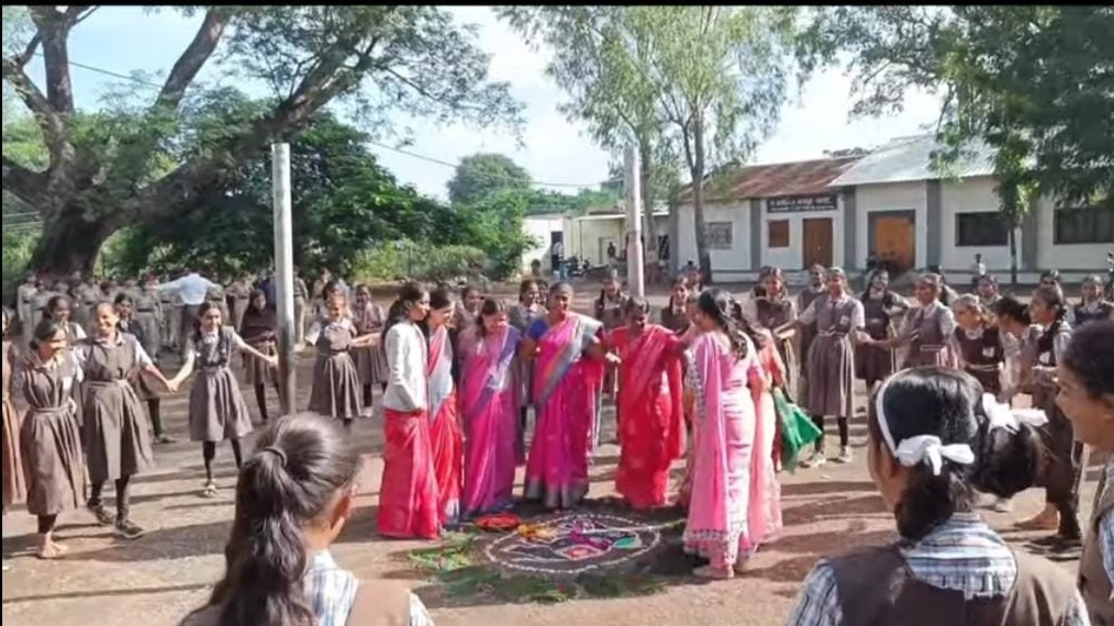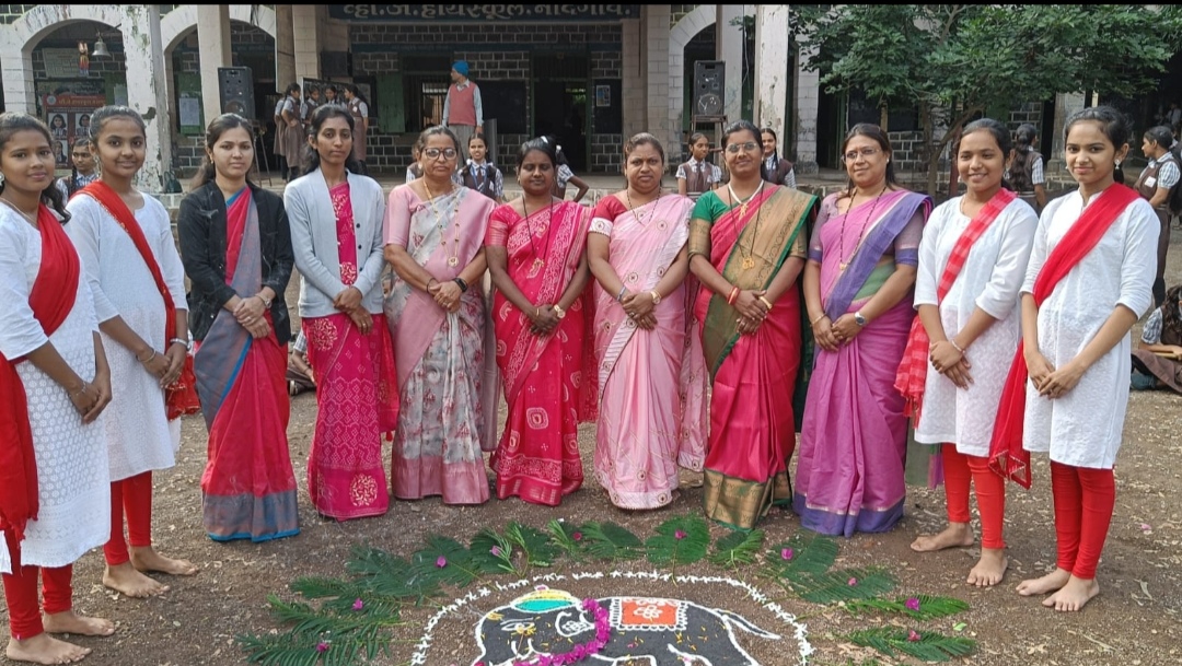 नांदगाव (वार्ताहार )” जागर आदि शक्तीचा “शारोदत्सव निमित्त व्ही जे हायस्कुल नांदगाव शाळेत ललिता पंचमीच्या दिवशी विद्देची देवता माँ सरस्वती देवीची स्थापना करून ” “भोडंला ” साजरा करण्यात आला प्रसंगी पाटी पुजन करण्यात आले विधार्थिनींना आपले पारंपारिक सण उत्सव व निर्सग यांचे असलेले नाते या संदर्भात माहिती देवून भोंडला कार्यक्रमाचे आयोजन करण्यात आले हत्तीच्या प्रतिमेचे पूजन करून भोंडल्याची गाणी घेण्यात आली या गाण्यातून होणारा शारीरिक व भावनिक विकास कसा होतो याविषयी महत्व पटवून देण्यात आले इ ८ वी व ९वी च्या ‘ विद्यार्थिनी व माता पालक यांच्यासाठी आपली संस्कृती व आपण या विषयावर व्याख्यानाचे आयोजन करण्यात आले