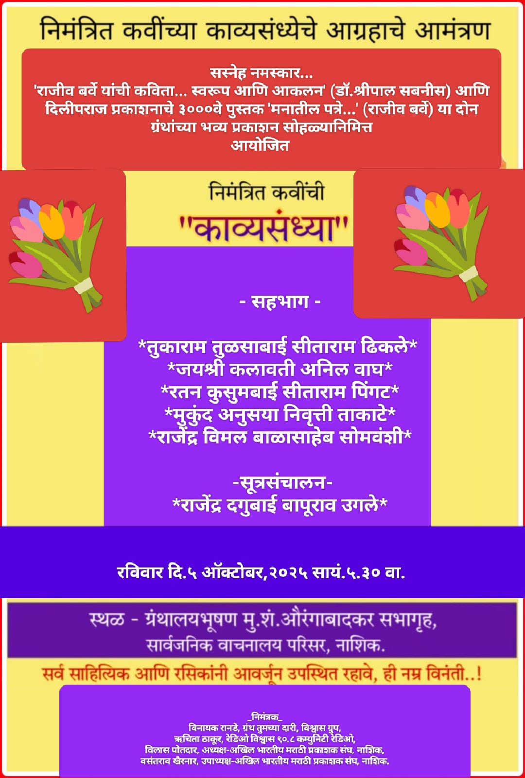 नाशिक:- (प्रतिनिधी )’राजीव बर्वे यांची कविता… स्वरूप आणि आकलन’ (डॉ.श्रीपाल सबनीस) आणि दिलीपराज प्रकाशनाचे ३०००वे पुस्तक ‘मनातील पत्रे…’ (राजीव बर्वे) या दोन ग्रंथांच्या प्रकाशनानिमित्त रविवार (दि.५) रोजी निमंत्रित कवींची “काव्यसंध्या” रंगणार आहे. सावानाच्या ग्रंथालयभूषण मु.शं.औरंगाबादकर सभागृहात सायंकाळी ५.३० वाजता होणाऱ्या काव्यसंध्येत ज्येष्ठ साहित्यिक तुकाराम तुळसाबाई सीताराम ढिकले, जयश्री कलावती अनिल वाघ, रतन कुसुमबाई सीताराम पिंगट, मुकुंद अनुसया निवृत्ती ताकाटे, राजेंद्र विमल बाळासाहेब सोमवंशी हे निमंत्रित कवी सहभागी होणार आहेत. सूत्रसंचालन कवी राजेंद्र दगुबाई बापूराव उगले करणार आहेत. साहित्यिक आणि रसिकांनी उपस्थित राहण्याचे आवाहन ग्रंथ तुमच्या दारी उपक्रमाचे प्रणेते विनायक रानडे, रेडिओ विश्वासच्या समन्वयक ऋचिता ठाकूर, अखिल भारतीय मराठी प्रकाशक संघाच्या नाशिक शाखेचे अध्यक्ष विलास पोतदार, उपाध्यक्ष वसंतराव खैरनार आदींनी केले आहे.