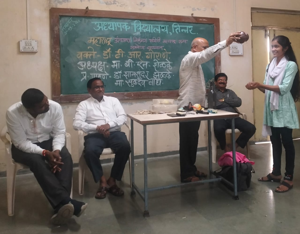 सिन्नर येथील कार्यक्रमात वैज्ञानिक चमत्कार प्रात्यक्षिक करताना डॉ.ठकसेन गोराणे ,समवेत प्राचार्य शेळके, डॉ .श्यामसुंदर झळके,हरिभाऊ तांबे इ