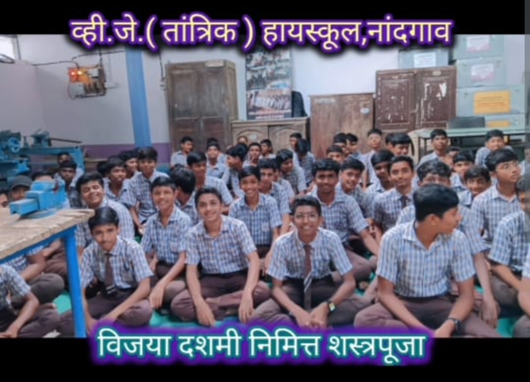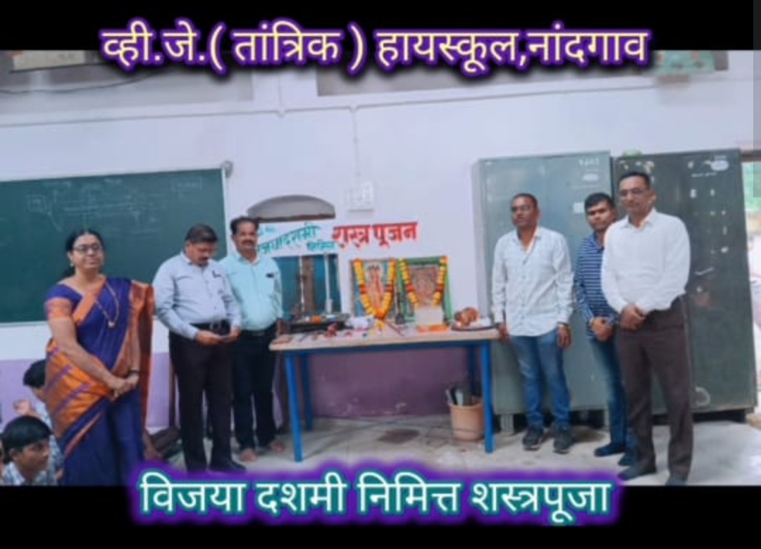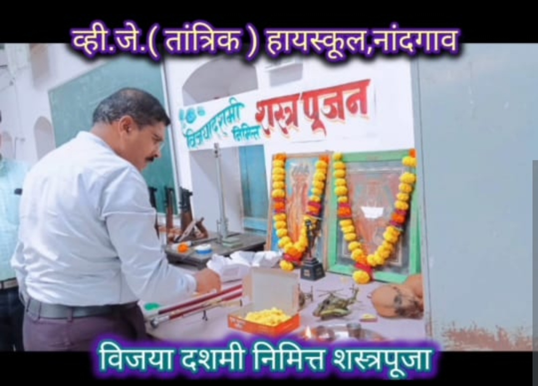 नांदगाव (वार्ताहार ) येथील वैजनाथ जिजाजी (व्हि.जे.) विद्यालयात खंडेनवमी अर्थात महानवमीच्या मुहूर्तावर विजयादशमीच्या निमित्ताने तांञिक विभागातील सर्व तांञिक आयुधांची पुजा अर्थात शस्त्रपूजन करण्यात आले._ _विद्यालयातील तांत्रिक (टेक्निकल) विभागाच्या नव्या तांत्रिक प्रयोगशाळेतील विवीध शस्ञांचे म्हणजेच तांत्रिक अवजारे- उपकरणांचे मान्यवरांच्या हस्ते परंपरेनुसार दरवर्षीप्रमाणे विधीवत् पूजन करण्यात आले.