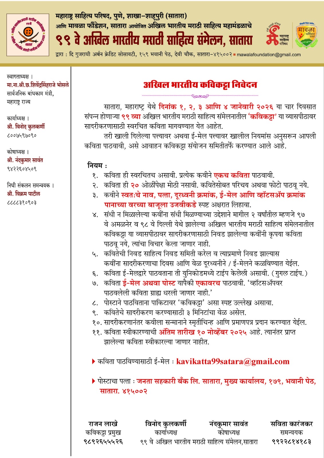 सातारा (प्रतिनिधी ) “सातारा येथे होणाऱ्या ९९व्या अखिल भारतीय मराठी साहित्य संमेलनातील नाशिक मधील ज्या कवींना आपल्या रचना सादर करायचा आहेत, त्यांच्यासाठी कवी कट्टामध्ये कविता सादर करण्याची सुवर्णसंधी उपलब्ध झाली आहे. त्यासाठी कवींनी आपल्या कविता आयोजकांकडे पाठवायच्या आहेत. एका कवीने केवळ एकच स्वरचित कविता पाठवावी. कविता जास्तीत जास्त २० ओळींची असावी. कविता केवळ ईमेल (kavikatta99satara@gmail.com) अथवा पोस्टाने ( जनता सहकारी बँक सातारा, मुख्य कार्यालय, १७९ भवानी पेठ, सातारा – ४१५००२ ) १० नोव्हेंबरपर्यंत पाठवावी” असे आवाहन महाराष्ट्र साहित्य परिषद शाखा नाशिकरोडचे कार्याध्यक्ष उन्मेष गायधनी, कार्यवाह रवींद्र मालुंजकर आणि कोषाध्यक्ष ॲड.सुदाम सातभाई यांनी केले.
