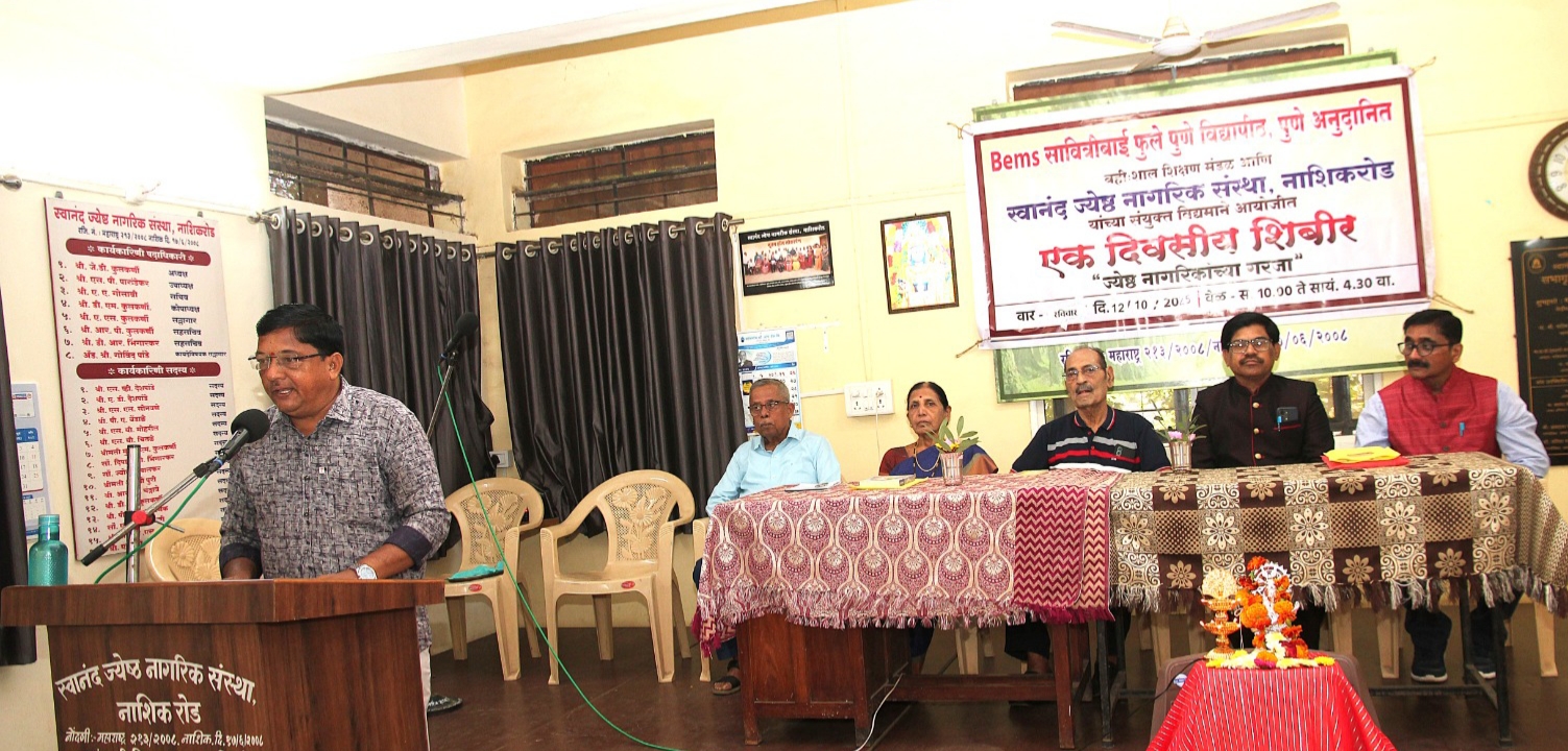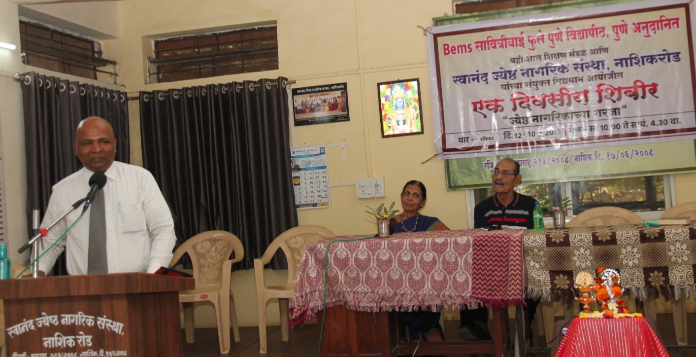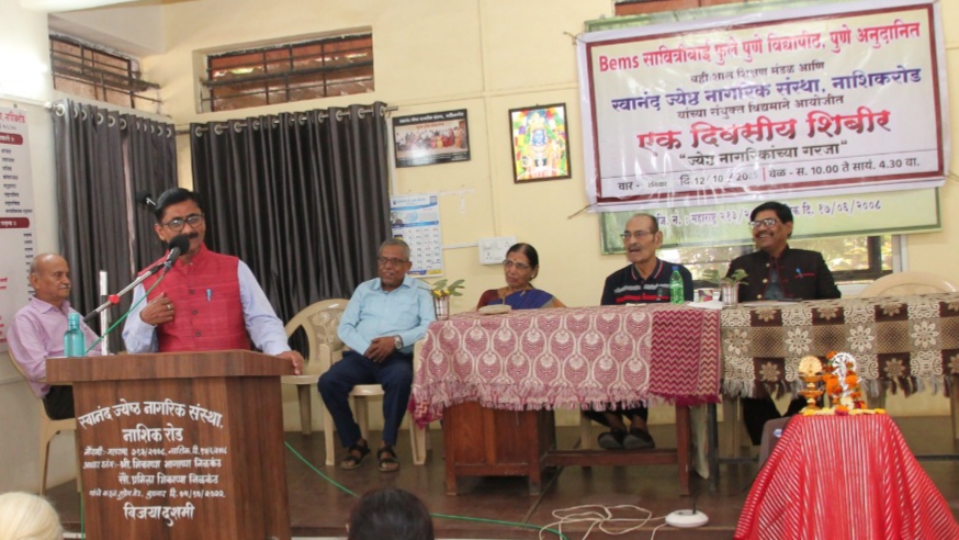 स्वानंद ज्येष्ठ नागरिक संघाच्या एकदिवसीय कार्यशाळेत बोलताना बिटको महाविद्यालयातील प्रा.डॉ.उत्तम करमाळकर. समवेत डावीकडून सुनंदा गोसावी, जयराम कुलकर्णी