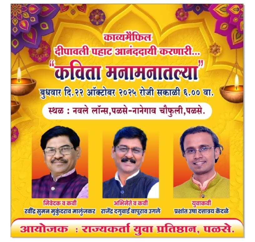 नाशिकरोड:-(प्रतिनिधी) उत्साह आणि चैतन्याचा सण असणारा दिवाळीचा सण पळसे येथील राज्यकर्ता युवा प्रतिष्ठानच्या माध्यमातून काव्यरूपी पाडवा पहाट उपक्रमाने अधिक रंगतदार होणार आहे. पळसे-नानेगाव चौफुलीवरील नवले लॉन्समध्ये बुधवारी (दि.२२) सकाळी ६ वाजता दीपावली पहाट आनंददायी करणारी ‘कविता मनामनातल्या’ ही आनंददायी काव्यमैफिल सलग तिसऱ्या वर्षी संपन्न होणार आहे. मैफिलीत युवाकवी प्रशांत केंदळे आणि चतुरस्त्र अभिनेते साहित्यिक राजेंद्र उगले सहभागी होणार आहेत. कवी रवींद्र मालुंजकर सूत्रसंचालन करतील. मैफिलीस उपस्थित राहण्याचे आवाहन राज्यकर्ता युवा प्रतिष्ठानच्या वतीने संजय गायधनी, संतोष गायधनी, दिलीप गायधनी, तुषार गायधनी, शरद तिदमे, अविनाश गायधनी, तुषार गडाख, सुनील गायधनी, रवींद्र गायधनी, श्रीकांत गायधनी, महेश जाधव, रोहित गायधनी, आदित्य गायधनी आदींनी केले आहे.