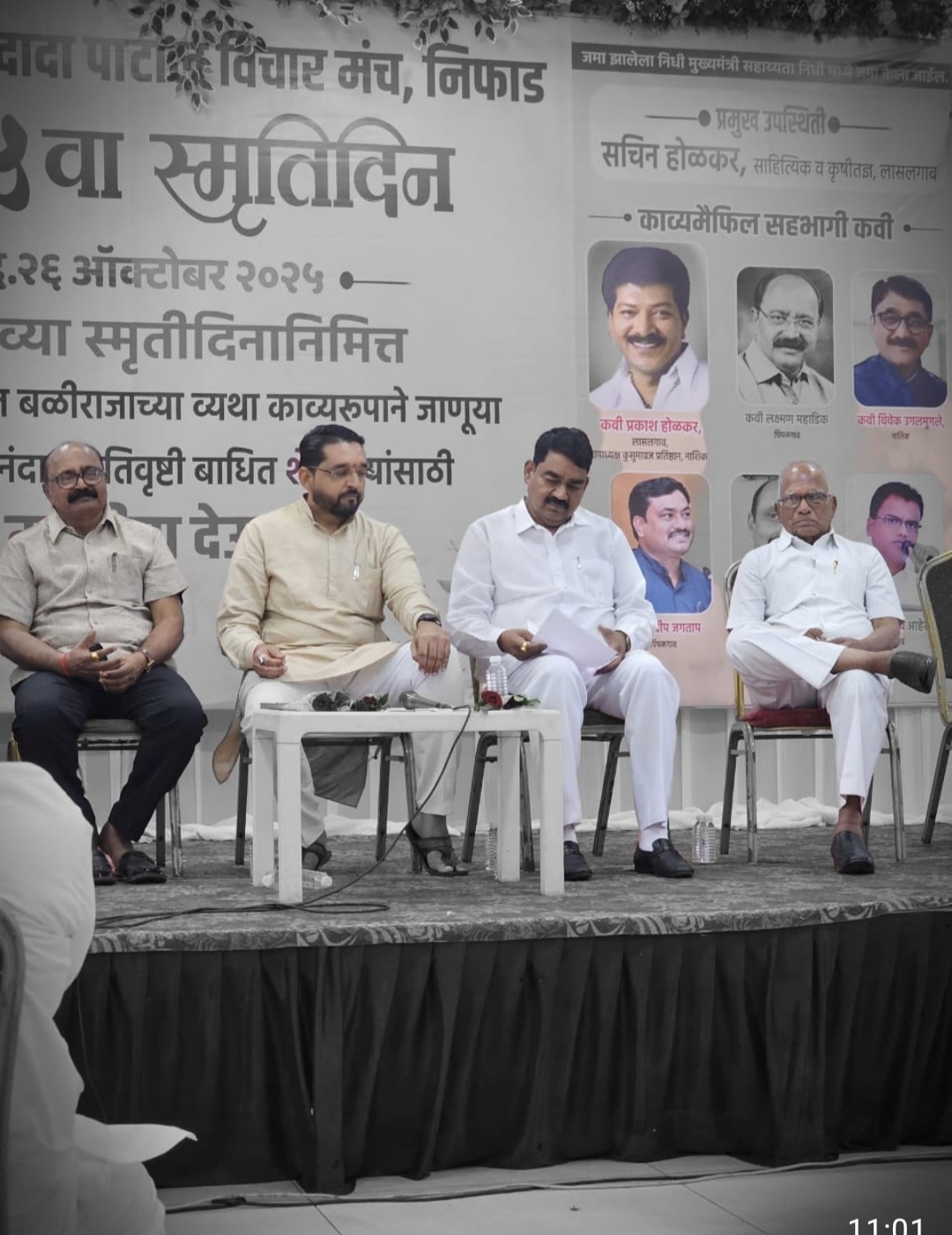 .कार्यक्रमासाठी प्रमुख अतिथी म्हणून आ.दिलीपराव बनकर, कृषी तज्ञ व साहित्यिक सचिन होळकर हे उपस्थित होते प्रास्ताविक वि.दा.व्यवहारे यांनी केले जेष्ठ कवी प्राचार्य लक्ष्मण महाडीक कवी प्रा. संदीप जगताप, विचारशील साहित्यिक विवेक उगलमुगले, आणि राजेंद्र सोमवंशी या मान्यवर कवींनी आपल्या काव्यरचनांद्वारे उपस्थितांचे मन भारावून टाकले.कवी संदीप जगताप व लक्ष्मण महाडीक यांनी सादर केलेल्या “शेतकरी आत्महत्या” या विषयावरील कवितांनी प्रेक्षकांना भावनिक केले. *“पिक दुष्काळात जळतं, पुरात वाहतं, अवकाळी सडतं, गारपिटीत झोडपतं… तुच सांग वर्षाकाठी वावरात काय शिल्लक राहतं..?*” या ओळींनी शेतकऱ्यांच्या व्यथांना आवाज दिला.त्याचबरोबर, *“बँक्वेट हॉलमधील साखरपुडा, डिजेवरची मेहंदी, लाखोंचं प्रि-वेडिंग शूटिंग… रक्त शोषून उधळपट्टी करणारे लग्न या सगळ्यांना फाटा देऊन साधं लग्न करण्याचा माझा पण नवा आहे, कारण मला माझा बाप जिवंत हवा आहे*” या आशयाच्या कवितेला विशेष दाद मिळाली.कवी राजेंद्र सोमवंशी यांनी फलटणमध्ये आत्महत्या केलेल्या तरुण डॉक्टर युवतीच्या दु:खद घटनेवर आधारित “अशीच पणती एखादी विझून जाते” या शीर्षकाची कविता सादर करताना प्रेक्षकांना अंतर्मुख केले. या कवितेतील “ कुठे चाललो आपण सारे, मनास प्रश्न विचारा ” या ओळींनी आत्मपरीक्षणाची हाक दिली.कार्यक्रमाचे सूत्रसंचालन कवी विवेक उगलमुगले यांनी करताना स्वर्गीय विनायकदादा पाटील यांच्या आठवणींना उजाळा दिला. त्यांनी “एक हात मदतीचा” या संकल्पनेचा उल्लेख करत, दादांच्या समाजकार्यातील प्रेरणादायी वाटचालीचा मागोवा घेतला.या प्रसंगी निफाड तालुक्याचे आमदार दिलीपराव बनकर, राष्ट्रवादी काँग्रेसचे तालुकाध्यक्ष राजेंद्र डोखळे, निफाडचे उपनगराध्यक्ष अनिल पाटील कुंदे, न्यायमुर्ती रानडे विद्याप्रसारक मंडळाचे विश्वस्त रतन पाटील वडघुले , माजी नगराध्यक्ष राजाभाऊ शेलार, अर्बन को-ऑप बँकेचे चेअरमन राजाभाऊ राठी, भाजपा जिल्हाध्यक्ष यतीन कदम, तसेच अँड. शांताराम बनकर, दुध संघाचे माजी चेअरमन शिवाजी ढेपले. अंजलीताई उगावकर, भारतीताई कापसे, डॉ. सिमा डेर्ले, मालती वाघावकर, रमेशचंद्र घुगे, वैकुंठ पाटील, भाऊसाहेब भवर, अँ इंद्रभान रायते, माणकेश्वर वाचनालयाचे अध्यक्ष मधुकर शेलार, प्रमोद जडे, नगरसेवक सागर कुंदे, दिलीप कापसे, निफाड नागरी सह. बँकेचे चेअरमन अशोक पोफळिया, डॉ. उत्तमराव डेर्ले, अँड. रामनाथ शिंदे, लक्ष्मणराव निकम, बबनराव सानप, मधुकर राऊत, सुनील जाधव,संजय गाजरे,भास्कर पानगव्हाणे,गौरव पानगव्हाणे, रमेश जाधव, तनवीर राजे, सागर निकाळे, सुहास सुरळीकर, दत्तात्रय डुकरे यांच्यासह निफाड तालुक्यातील अनेक मान्यवर उपस्थित होते. शिवाजीराजे ढेपले यांन