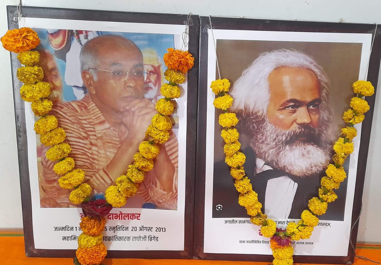 अशा क्रांतिकारी विचारवंत दिवंगत डाॅ.नरेंद्र दाभोलकर यांना विनम्र अभिवादन *तसेच कार्ल मार्क्स* हे १९ व्या शतकातील एक जर्मन अर्थशास्त्रज्ञ व तत्त्वज्ञ होते. त्यांनी अनेक विषयांवर लिखाण केले पण त्यांचे वर्गसंघर्षावरील लिखाण हे जास्त प्रसिद्ध आहे. फ्रेडरिक एन्जेल्स प्रमाणे मार्क्सने देखील तत्कालिन राजकीय लढ्यांमध्ये भाग घेतला. कार्ल मार्क्स यांनी “दास कॅपिटाल” या ग्रंथाचा पहिला खंड इ.स.१८६७ मध्ये प्रसिद्ध केले.कार्ल मार्क्स यांच्या विचारांची लोकप्रियता सोव्हिएट रशियाच्या विघटनानंतर कमी झाली असली तरी ते विचार शिक्षण क्षेत्र, राजकीय क्षेत्र, कामगार लढा यामध्ये अजूनही लोकप्रिय आहेत. मार्क्स यांचे विचार अनेक कम्युनिस्ट राज्ये आणि राजकीय चळवळींमध्ये अजूनही आदर्श मानले जातात.ते वर्ग संघर्षाचे प्रणेते होते प्रमुख योगदान आणि विचार वर्ग कार्ल मार्क्स यांच्या मते, सर्व इतिहास हा वर्ग संघर्षाचा इतिहास आहे. त्यांनी भांडवलदार वर्ग आणि कामगार वर्ग यांच्यातील सततच्या संघर्षावर जोर दिला.व जगातील सर्व कामगार वर्ग संघटीत होण्यासाठी आव्हान करणारे कार्ल मार्क्स यांना विनम्र अभिवादन *या कार्यक्रमचे सुत्रसंचलन प्राध्यापक रविंद्र कांबळे सर यांनी केले व प्रास्थाविक विजय मुठे यांनी केले.तर आभार रुपेश मुठे यांनी मानले*याप्रसंगी महामित्र दत्ता वायचळे, आद्यक्रांतीकारक राघोजी ब्रिगेड चे सहसंस्थापक विजय मुठे, मा.नगरसेवक रूपेशभाऊ मुठे प्राध्यापक रविंद्र कांबळे सर,सुरज गोसावी,शाम डांगे, सोपन डगळे,रमेश सालमुठे संदीप मुठे आदि उपस्थित होते