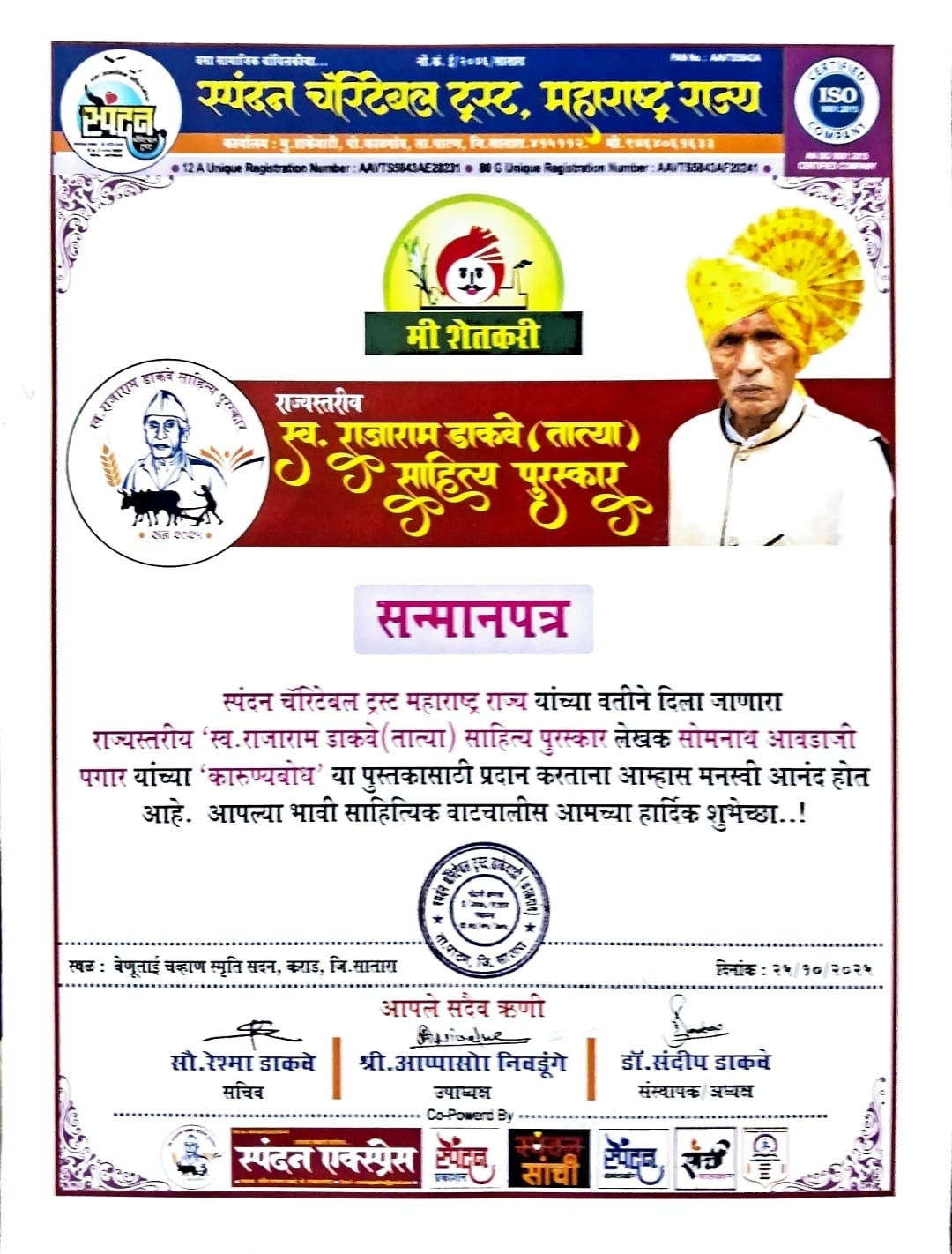 यावेळी नाशिक येथील गीतकार/ कवी सोमनाथ पगार यांच्या ‘कारण्यबोध’ (वैश्विक महामारी कोरोना काळातील भयावह परिस्थितीचा साहित्यिक दस्ताऐवज) या कवितासंग्रहाला डाकेवाडी येथील या प्रतिष्ठित स्पंदन चॅरिटेबल ट्रस्टचा राज्यस्तरीय स्व. राजाराम डाकवे (तात्या) साहित्य पुरस्कार’ साम टीव्ही न्यूजचे संपादक निलेश खरे, प्रेरणादायी वक्ते डॉ. विनोद बाबर, महंत अहिल्यागिरिजी महाराज यांच्या शुभहस्ते मोठ्या उत्साहात प्रदान करण्यात आला. त्यांच्या काव्य लेखणाची दखल घेवून त्यांचा हा सन्मान करण्यात आला.आनंदाची बाब म्हणजे प्रधानमंत्री चित्रपटात गीतकार सोमनाथ पगार यांनी लिहलेल्या गीताला ज्यांचा स्वरसाज लाभला आहे, असे सुप्रसिद्ध गायक विजय सरतापे यांच्या उपस्थितीत हा पुरस्कार सोहळा दिमाखात पार पडला. हे विशेष.सोमनाथ पगार हे उदयोन्मुख गीतकार, कवी, लेखक, ट्रान्सलेटर, युट्युबर, ब्लॉगर तसेच विविध साहित्यिक कलाकृतींच्या पुस्तक परिचय तसेच परीक्षण लिहण्यासाठी साहित्य क्षेत्रात सर्वांच्या परिचयाचे असून नाशिक येथील निगळ फिल्म्स प्रोडक्शन निर्मित ‘प्रधानमंत्री’ या चित्रपटाचे ते गीतकार तसेच ‘श्री. संत नारायणनंद काठे महाराज महिमा’ ही मराठी भक्ती गीते तर ‘ऐका हो ऐका माझ्या बळीराज्याची कथा’ ही मराठी शेतकरी गीते यासाठी त्यांनी गीतलेखन केले आहे.पुरस्कार हा केवळ एक सन्मान नसून, सामाजिक जबाबदारीची जाणीव करून देणारा तसेच पुढील कार्यासाठी प्रेरणा देणारा मोठा आधार आहे. या पुरस्कारामुळे माझ्या कार्याला एक नवीन ओळख मिळाली आहे, जी यापुढे अधिक उत्साहाने लिखाणास करण्यासाठी बळ देईल. असे यावेळी सोमनाथ पगार यांनी सांगितले.या पुरस्काराबद्दल त्यांचे साहित्यिक, कला, मनोरंजन, सामाजिक, राजकीय इत्यादी सर्वच स्तरांतून अभिनंदन व कौतुकाचा वर्षाव होत आहे.कार्यक्रमाचे प्रास्ताविक डॉ. संदीप डाकवे, सूत्रसंचालन सौ. अंजली गोडसे, तर आभार प्रदर्शन चंद्रकांत चव्हाण यांनी मानले. दीपप्रज्वलन व कु. माधुरी करपे हिच्या कथ्थकच्या नृत्यातील गणेश वंदनेने कार्यक्रमाची सुरवात झाली.कार्यक्रम यशस्वी करण्यासाठी विशाल डाकवे, सुरेश मस्कर, सत्यवान मंडलिक, समाधान पाटील, जालिंदर येळवे, (फौजी), चंद्रकांत चव्हाण, बशराज चल्लान, गुलाब जाधव, (फौजी), भीमराव धुळप, ओमकार धुळप, रेश्मा डाकवे, पूनम वाचन, शीतल दवणे, गौरी डाकवे, पौर्णिमा डाकवे, प्रथमेश डाकवे यांनी विशेष परिश्रम घेतले.