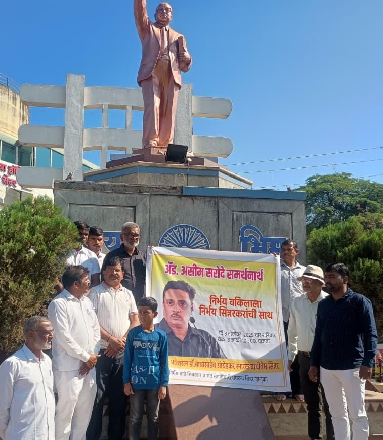 सिन्नर ( प्रतिनिधी)बार कौन्सिल ऑफ महाराष्ट्र व गोवा यांच्या आदेशानुसार ऍड असीम सरोदे यांची सनद रद्द करण्याच्या विरोधात शनिवार दि,8 नोव्हेंबर 2025 रोजी भारतरत्न डॉ बाबासाहेब आंबेडकर स्मारक वावी वेस सिन्नर येथे निर्भय बनो टीम व समविचारी संघटनाच्या वतीने निदर्शन करण्यात आली,