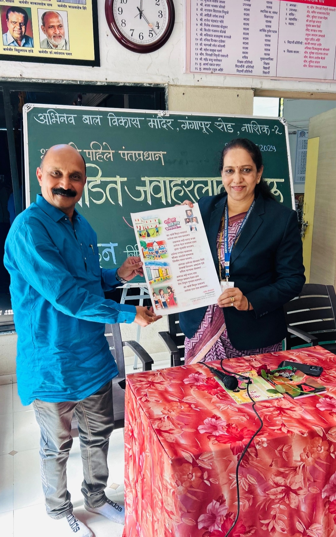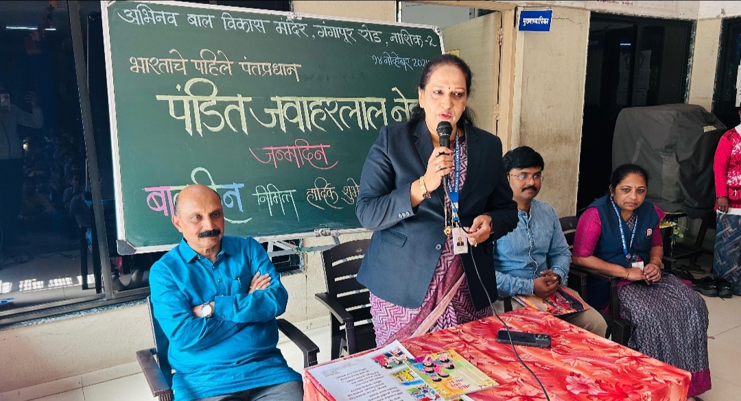 नाशिक (प्रतिनिधी ) मविप्र समाजाचे आदर्श शिशुविहार व अभिनव बालविकास मंदिर, गंगापूर रोड, नाशिक २ या शाळेत पंडित जवाहरलाल नेहरू यांचा जन्मदिन बालदिन म्हणून मोठ्या उत्साहात साजरा झाला .बालदिनाचे औचित्य साधून अभिनवच्या बालगोपाळांना भेटीस आलेले प्रमुख अतिथी व बालसाहित्यिक राजेंद्र सोमवंशी, होरायझन अकॅडमीचे संगीत शिक्षक अभिजीत सुरळीकर व शाळेच्या मुख्याध्यापिका मीनाक्षी गायधनी , संगीता जाधव, ज्येष्ठ शिक्षिका रंजना पाटील,अर्चना ठाकरे , विलास जाधव, अर्चना वाळके, उपस्थित होते,