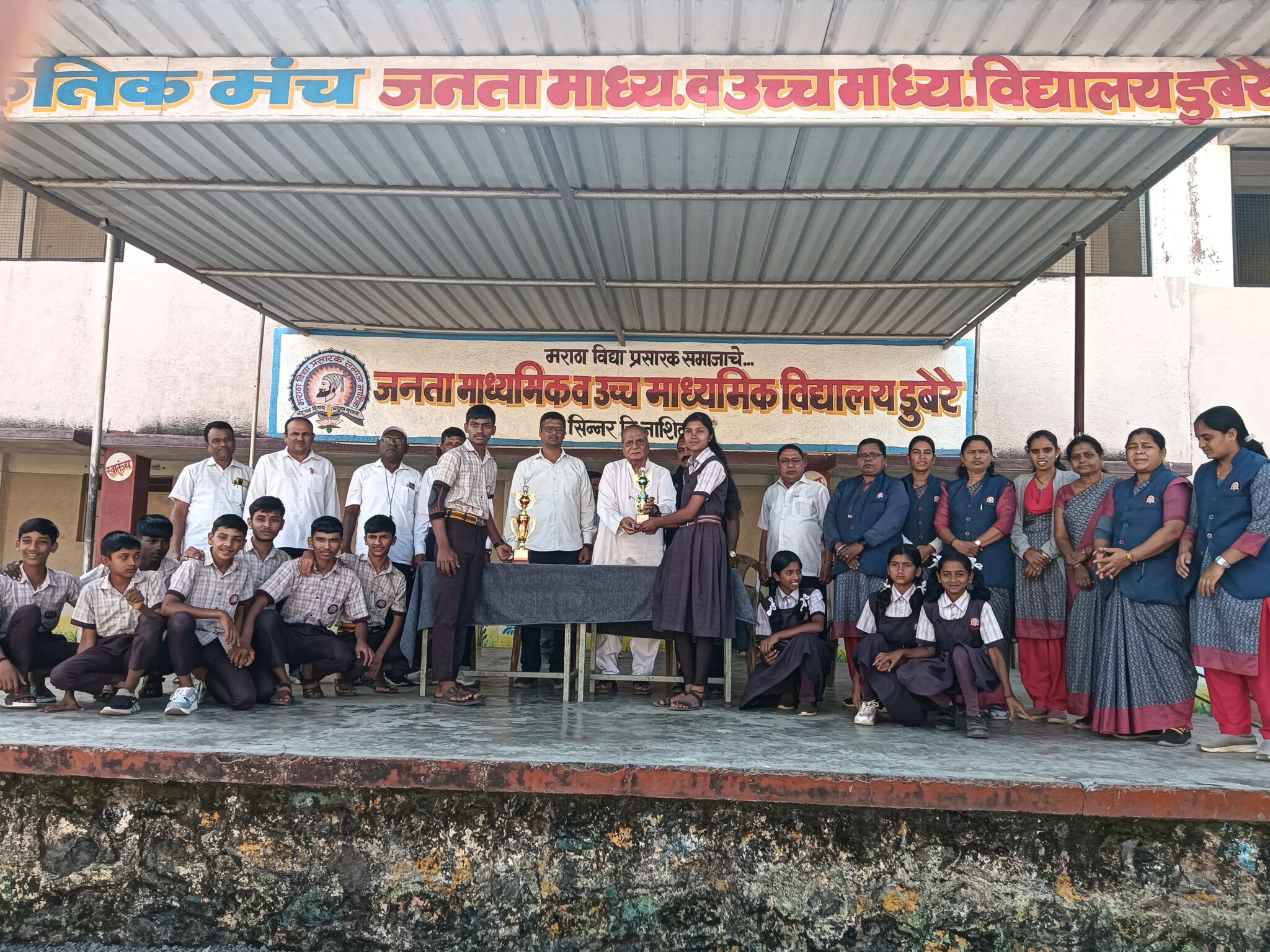 सिन्नर प्रतिनिधी( सोमनाथ गिरी) :- मराठा विद्या प्रसारक समाज संस्था संचलित जनता माध्यमिक व उच्च माध्यमिक विद्यालयाने मविप्र संस्था कर्मवीर चषक कबड्डी स्पर्धेत घवघवीत यश प्राप्त केले. १७ वर्षाआतील मुलांच्या संघाने प्रथम क्रमांक मिळविला असून या संघाची जिल्हास्तरीय कबड्डी स्पर्धेसाठी निवड झाली आहे . स्पर्धेत ईश्वर पडवळ, पियुष पडवळ, प्रमोद वाजे ,आदेश वाजे , हर्षद वाजे, सार्थक ढोली, आयुष माळी, राहुल गोफणे, सार्थक वारुंगसे,सार्थक कडभाने या विद्यार्थ्यांनी सहभाग घेतला.