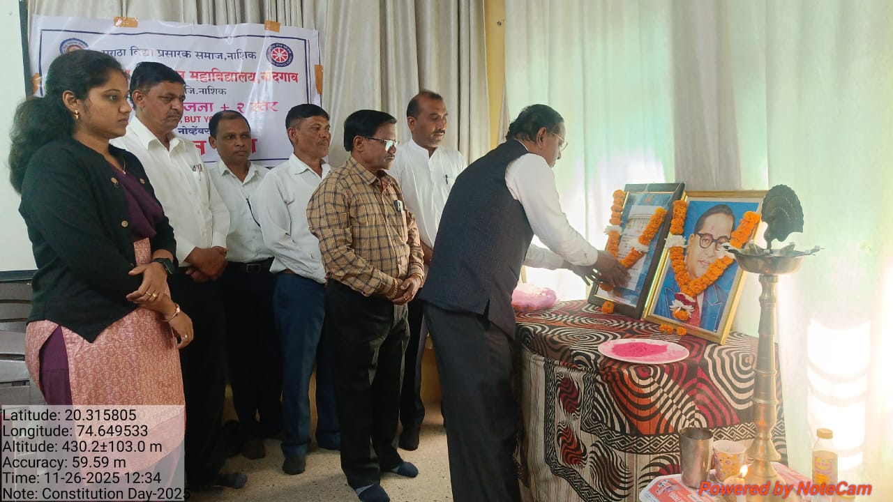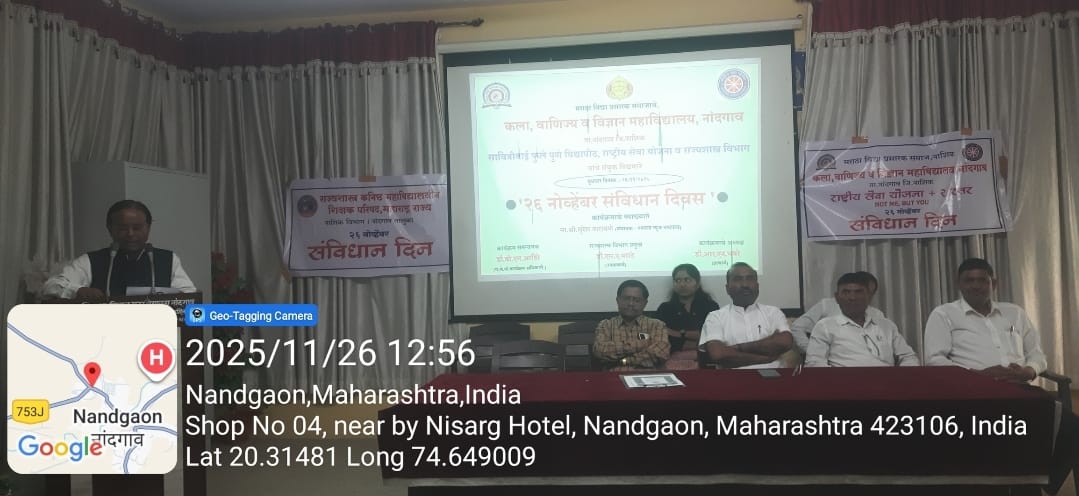 नांदगांव (प्रतिनिधी )कला,वाणिज्य व विज्ञान महाविद्यालय, नांदगांव येथे राष्ट्रीय सेवा योजना तसेच राज्यशास्त्र विभागाच्या वतीने संविधान दिन मोठ्या उत्साहात साजरा करण्यात आला. सदर प्रसंगी कार्यक्रमाचे अध्यक्ष महाविद्यालयाचे प्राचार्य डॉ. आर.एन.भवरे यांनी आपल्या मनोगतातून संविधानाचे मानवी जीवनातील महत्त्व विशद केले तसेच संविधान हा देशाचा आत्मा असल्याचे प्रतिपादित करून विद्यार्थ्यांनी भारतीय संविधानाचे वाचन करण्याचे आवाहन केले.