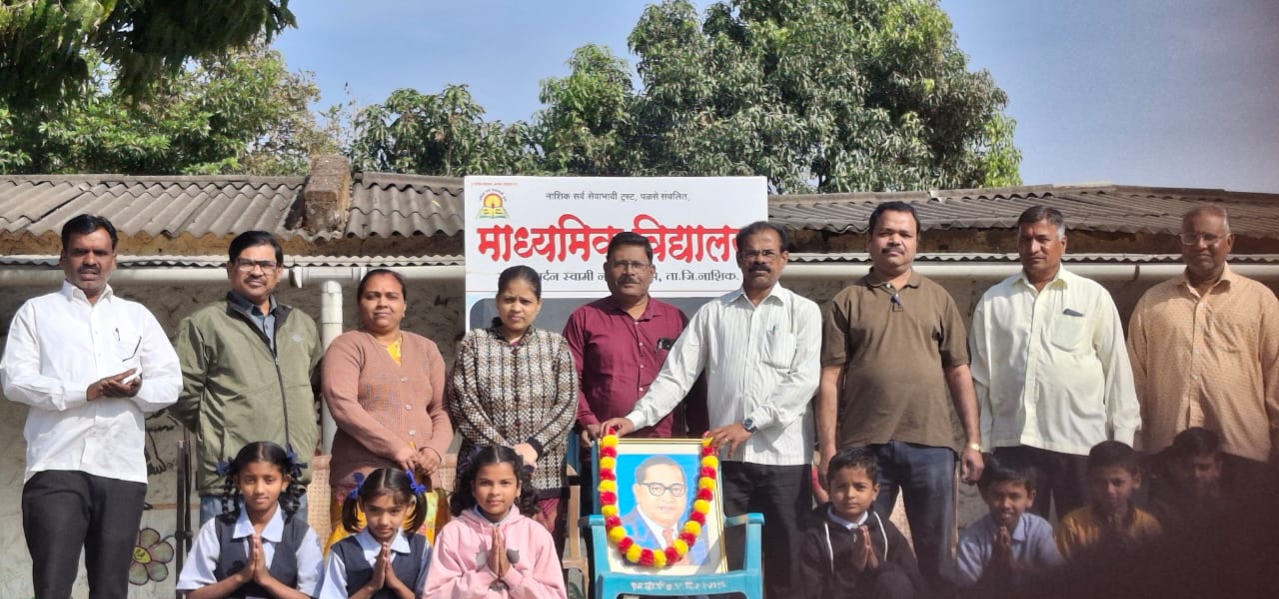 नासाका विद्यालयात डॉ.बाबासाहेब आंबेडकर यांना महापरिनिर्वाणदिनी अभिवादन करताना मुख्याध्यापक अरुण पगार, विद्यार्थी, शिक्षक-कर्मचारी.