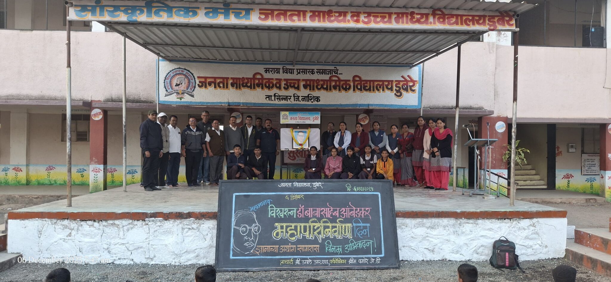 सिन्नर प्रतिनिधी( सोमनाथ गिरी ): – डुबेरे येथील जनता माध्यमिक व उच्च माध्यमिक विद्यालयात भारतीय घटनेचे शिल्पकार, महामानव डॉ.बाबासाहेब आंबेडकर यांना महापरिनिर्वाण दिनानिमित्त अभिवादन करण्यात आले.कार्यक्रमाच्या अध्यक्षस्थानी विद्यालयाचे मुख्याध्यापक रंगनाथ उगले होते.व्यासपीठावर ज्येष्ठ शिक्षक सोमनाथ गिरी, कचेश्वर शिंदे,रेखा खंडीझोड,सुनिल ससाणे आदी उपस्थित होते. उपस्थितींच्या हस्ते डॉ .आंबेडकर यांच्या प्रतिमेचे पूजन करण्यात आले. डॉ. आंबेडकर यांच्या जीवन व कार्याचा पर्यवेक्षिका जयश्री पगारे, मानसी हिरे विद्यार्थ्यांनीसह उपशिक्षक रेवणनाथ कांगणे यांनी करून दिला.सम्यक रुपवते व संकल्प रुपवते यांनी डॉ. आंबेडकरांवर गीते सादर केली.