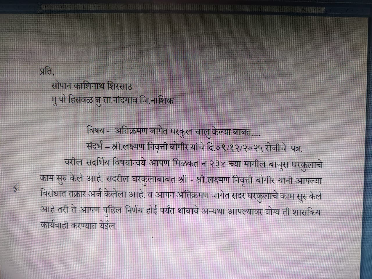 अतिक्रमी ठरविण्यात आलेल्या ऑपरेटर सोपान शिरसाठ यांना बांधकाम थांबविण्यासाठी पत्र दिल्याचे यादव यांनी सांगितले.