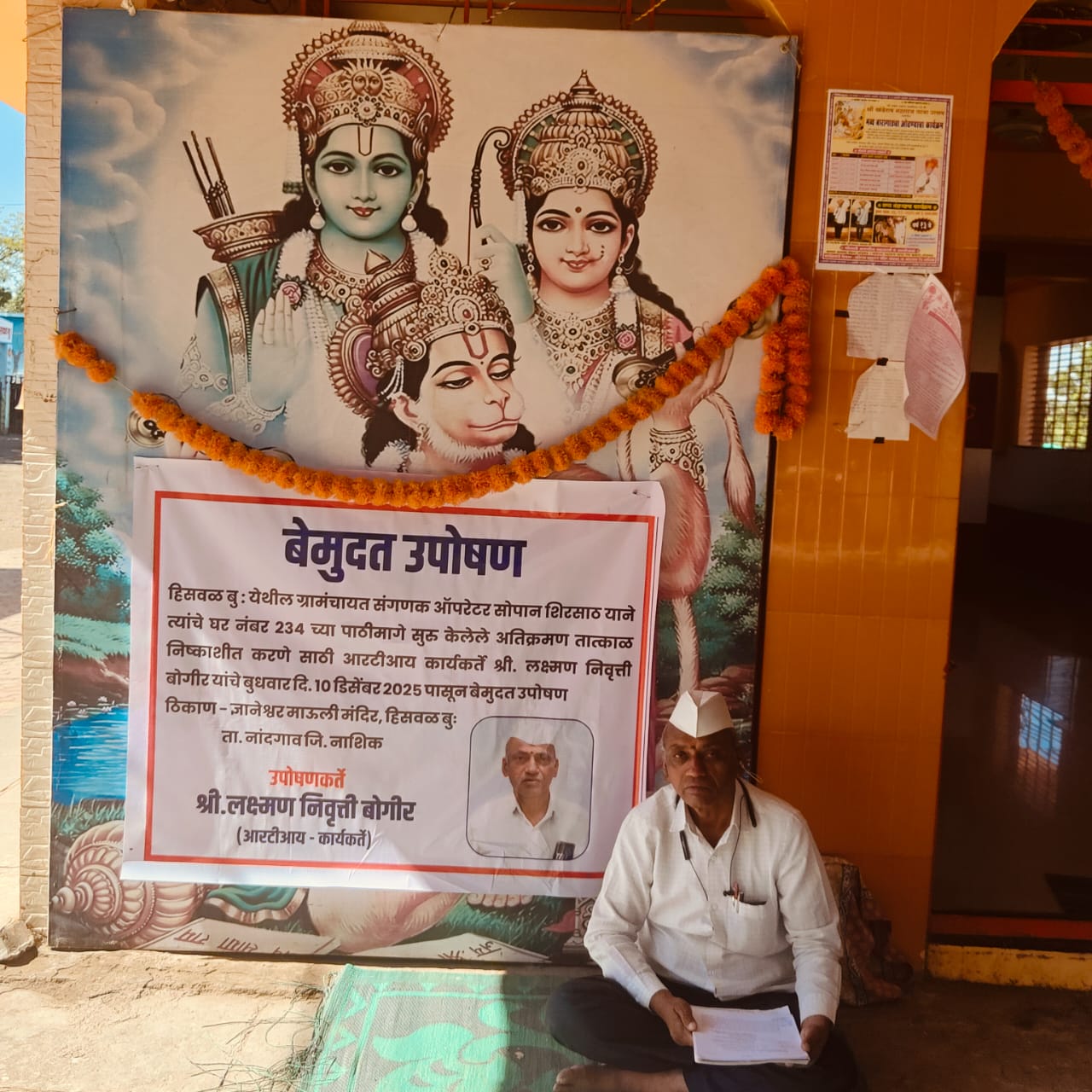 हिसवळ बु. (ता. नांदगाव, जि. नाशिक) येथे ग्रामपंचायतीच्या मोकळ्या जागेवरील alleged अतिक्रमण तात्काळ हटविण्याच्या मागणीसाठी आरटीआय कार्यकर्ते लक्ष्मण निवृत्ती बोगीर यांनी आज सकाळी १० वाजता ज्ञानेश्वर माऊली मंदिर परिसरात बेमुदत उपोषणास सुरुवात केली.
