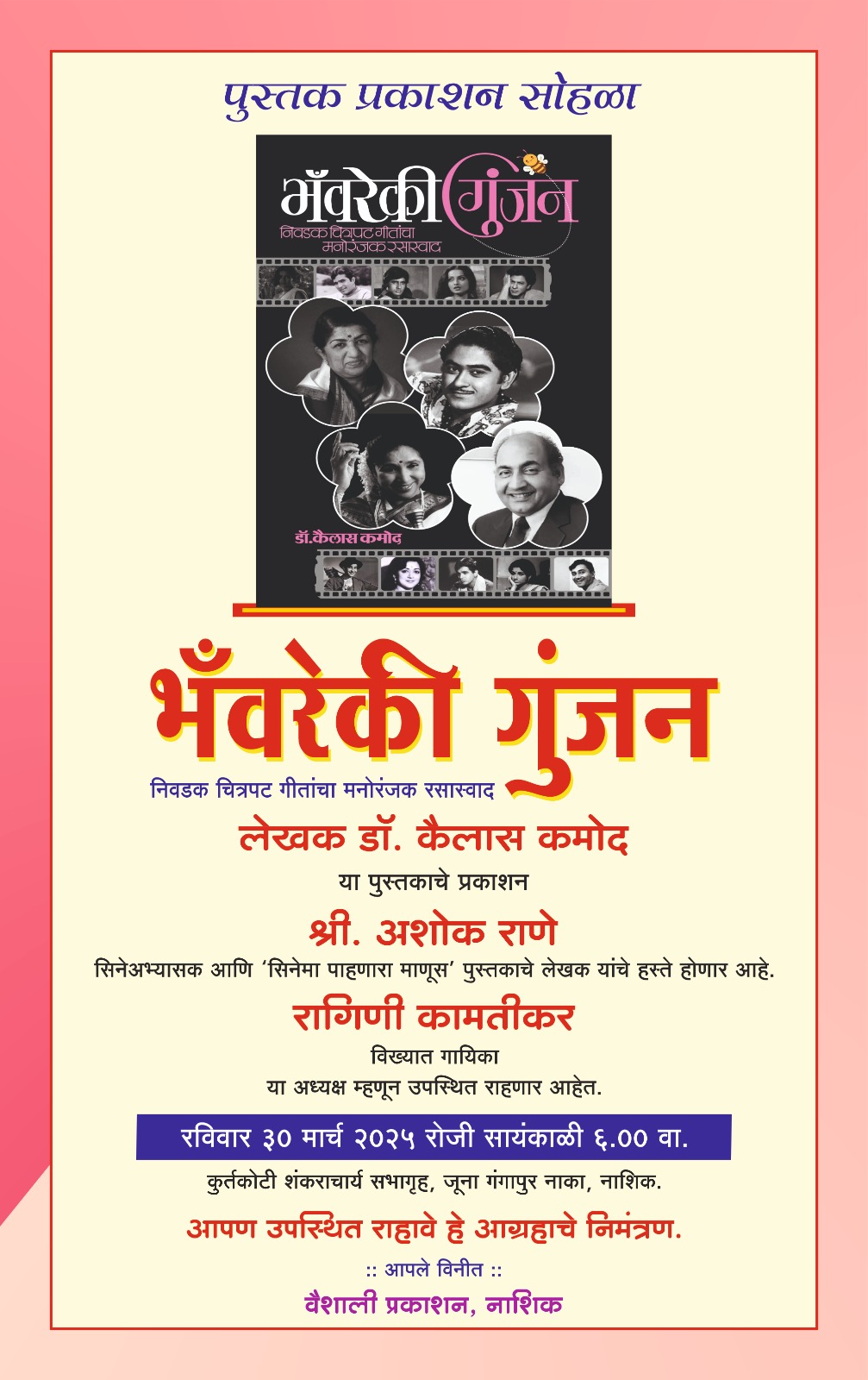’नाशिक (प्रतिनिधी) सुप्रसिद्ध लेखक.डॉ कैलास कमोद.यांच्या *भवरे की गुंजन* या पुस्तक प्रकाशनाचे आयोजन करण्यात आले आहे.निवडक हिंदी चित्रपट गीतांचा मनोरंजक रसग्रहण असलेल्या या पुस्तकाचे प्रकाशन सिने अभ्यासक अशोक राणे यांच्या शुभहस्ते संपन्न होणार आहेयावेळी कार्यक्रमाच्या अध्यक्षा विख्यात गायिका रागिणी कामतीकर असणारं आहेत. गाण्याचे संगीत,गीतरचना ,पडद्यावरील दृश्य, गाण्यातील सौंदर्य स्थळे,शोधून त्याचे रसग्रहण या पुस्तकात आहे.*रविवार 30 मार्च 2025* रोजी सायंकाळी 6 वाजता हा कार्यक्रम होणार आहे. शंकरा चार्य न्यास ,गंगापूर नाका येथे हा कार्यक्रम संपन्न होणार आहे. या कार्यक्रमास मोठ्या संख्येने व्हावे, असे आवाहन वैशाली प्रकाशनाचे विलास पोतदार यांनी केले आहे.