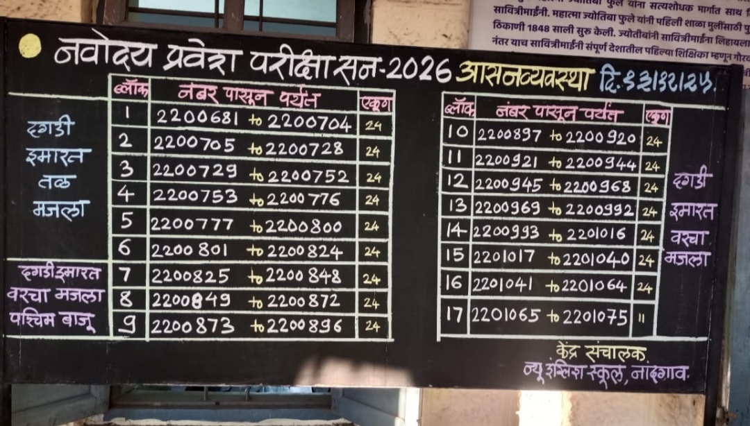 इंग्लिश संकुल नांदगाव: जवाहर नवोदय विद्यालय चाचणी परीक्षा 2025-26 साठी केंद्र क्रमांक 13: 11: 09:01 न्यू इंग्लिश स्कूल नांदगाव परीक्षार्थींची बैठक व्यवस्था वरील प्रमाणे आहे.
