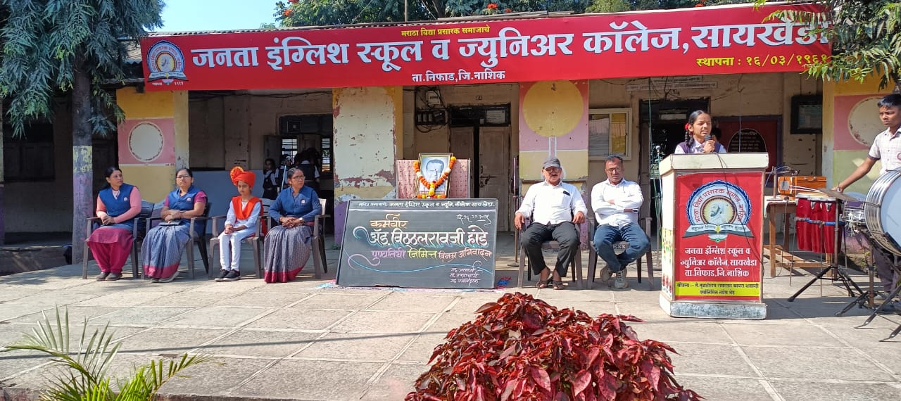 सायखेडा ( प्रतिनिधी) येथील जनता इंग्लिश स्कूल शाळेत कर्मवीर ॳॅड. विठ्ठलराव हांडे यांच्या पुण्यतिथीनिमित्त इयत्ता सहावीच्या विद्यार्थ्यांनी बालसभेचे आयोजन कु. अवनी आघाव या विद्यार्थ्यांनीच्या अध्यक्षते खाली केले . यावेळी मंजरी गुजराथी, धनश्री कुटे,ॳॅड. हांडे साहेबांच्या जीवनाविषयी व त्यांच्या शैक्षणिक व सामाजिक कार्याविषयी ची माहिती दिली.