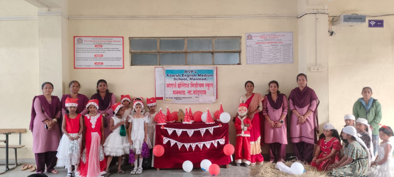 मनमाड (प्रतिनिधी ) नाशिक मराठा विद्या प्रसारक समाजाचे आदर्श इंग्लिश मेडीयम येथे ख्रिसमस नाताळ आनंदात साजरा करण्यात आला.येशुचे प्रतिमा पूजन शाळेचे मुख्याध्यापिका आहेर शितल यांच्या हस्ते करण्यात आले.