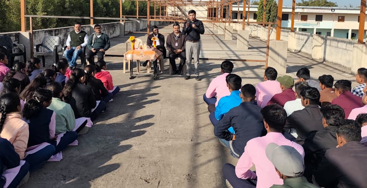 समवेत प्रमुख पाहुणे म्हणून संस्थेचे सचिव महेंद्र पाटील, समन्वयक निंबाजी शिंदे, प्राचार्य पी. एन. पवार, पर्यवेक्षक व्ही. डी. काळे, सर्व प्राध्यापक, शिक्षकेतर कर्मचारींसह बहुसंख्येने विद्यार्थी उपस्थित होते. विद्यार्थ्यांनी केवळ स्पर्धा परीक्षांसाठीच नव्हे तर जीवनाच्या प्रत्येक टप्प्यावर यशस्वी होण्यासाठी जिद्द, कष्ट, वेळेचे शिस्तबद्ध नियोजन आणि आत्मविश्वास या गुणांचा स्वीकार करणे आवश्यक आहे. ग्रामीण विद्यार्थ्यांनी अधिकाधिक आवांतर वाचन करावे असे आवाहन प्रसंगी प्रा. पाटील यांनी केले. यावेळी विद्यार्थ्यांच्या विविध शंकांचे निरसन करण्यात आले. सूत्रसंचालन प्रा. अमोल अहिरे यांनी केले, परिचय प्रा. सी. डी. राजपूत यांनी करुन दिला तर आभार प्रा. पी. यु. शिंदे यांनी मानलेत.