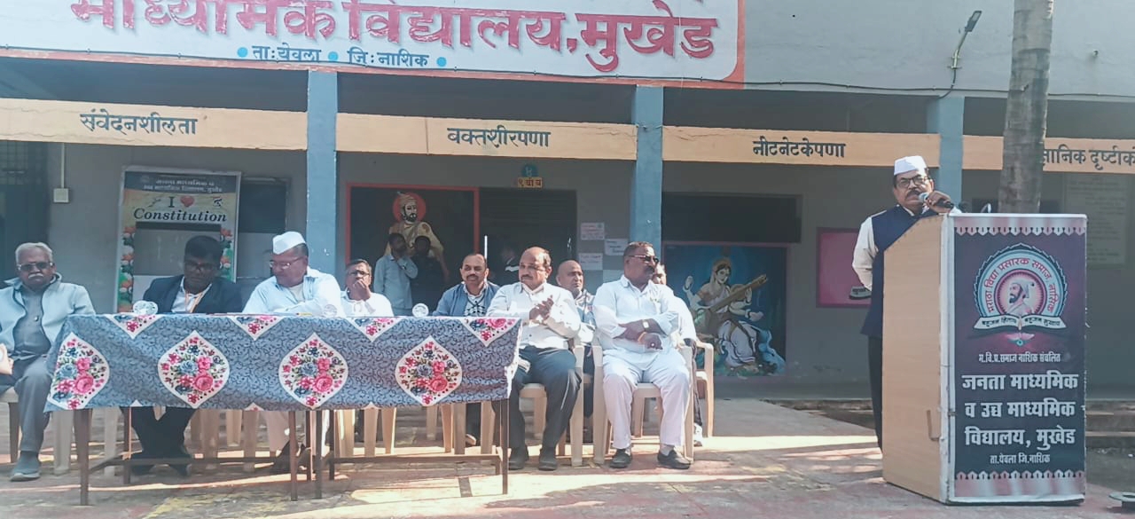 मुखेड (प्रतिनिधी ) दिनांक २६/१२/२०२५रोजी जनता माध्यमिक आणि उच्च माध्यमिक विद्यालय मुखेड, तालुका येवला येथे आयोजित शिक्षक पालक मेळाव्याचे उदघाटन प्रसंगी इंजि.कवी श्री वाळू आहेर बोलत होते.