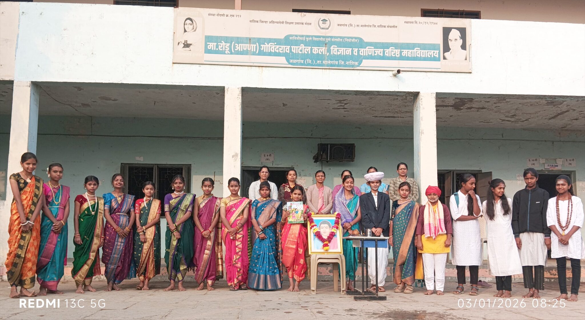 यावेळी इयत्ता ५ वी च्या स्वरा किशोर ढोणे हिने सावित्रीबाईंची तर ८ वीच्या श्रावणी सचिन दुकळे हिने ज्योतिबांची केलेली वेशभूषा सर्वांच्या आकर्षणाचा केंद्रबिंदू ठरला. प्रास्तविक नरेंद्र अहिरे यांनी केले, सूत्रसंचालन ए. एम. साळुंके यांनी केले तर आभार प्रा. अमोल अहिरे यांनी मानलेत.