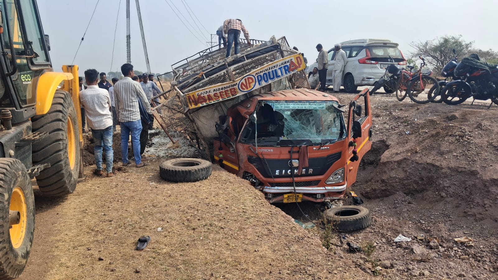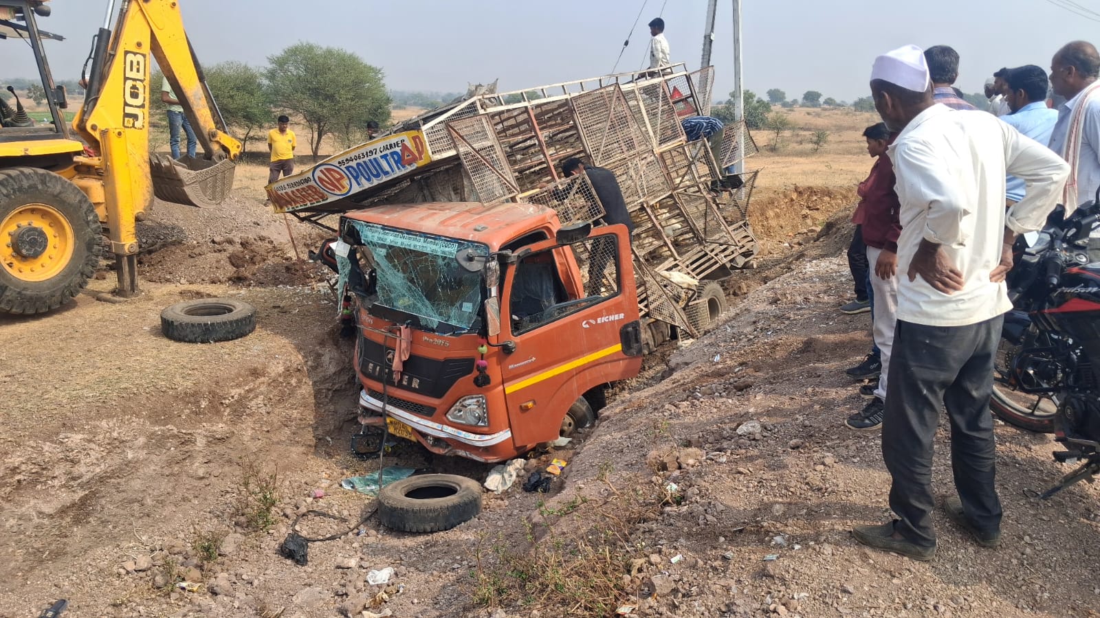 पांढरवड येथील दिलीप गुलाब चव्हाण यांच्या पोल्ट्रीतून बांद्रा मुंबई येथे घेऊन चाललेल्या बॉयलर कोंबडीचा ट्रक (एम एच ०४ MH २०३८) निमतळे वस्तीलगत गाडीत बिघाड झाल्याने व रस्त्याचा अंदाज न आल्याने रस्त्याच्या कडेला काल शुक्रवारी रात्री बारा वाजेच्या सुमारास पाच फूट दरीत पलटी झाला. गाडीत चार टन वजनाच्या एक हजार सातशे कोंबड्या होत्या. गाडी अचानक खड्ड्यात गेल्याने सर्व कोंबड्या एकमेकांवर आदळल्या गेल्या कोंबड्या पिंजऱ्यामध्ये पॅक असल्याने जागीच गुदमरल्या व मरण पावल्या. आजचा जिवंत कोंबडी १२० रुपयाचा भाव आहे. गाडीत चार टन वजनाच्या कोंबड्या भरलेल्या असल्याने पाच लाखांचे नुकसान झाले असल्याचे बोलले जात आहे.ट्रक चालक इकबाल किरकोळ जखमी झाला असून, आज शनिवारी मृत कोंबड्या जेसीबीच्या साह्याने खड्डा करून त्यात बुजवण्यात आल्या.