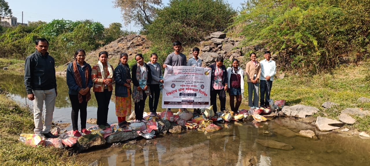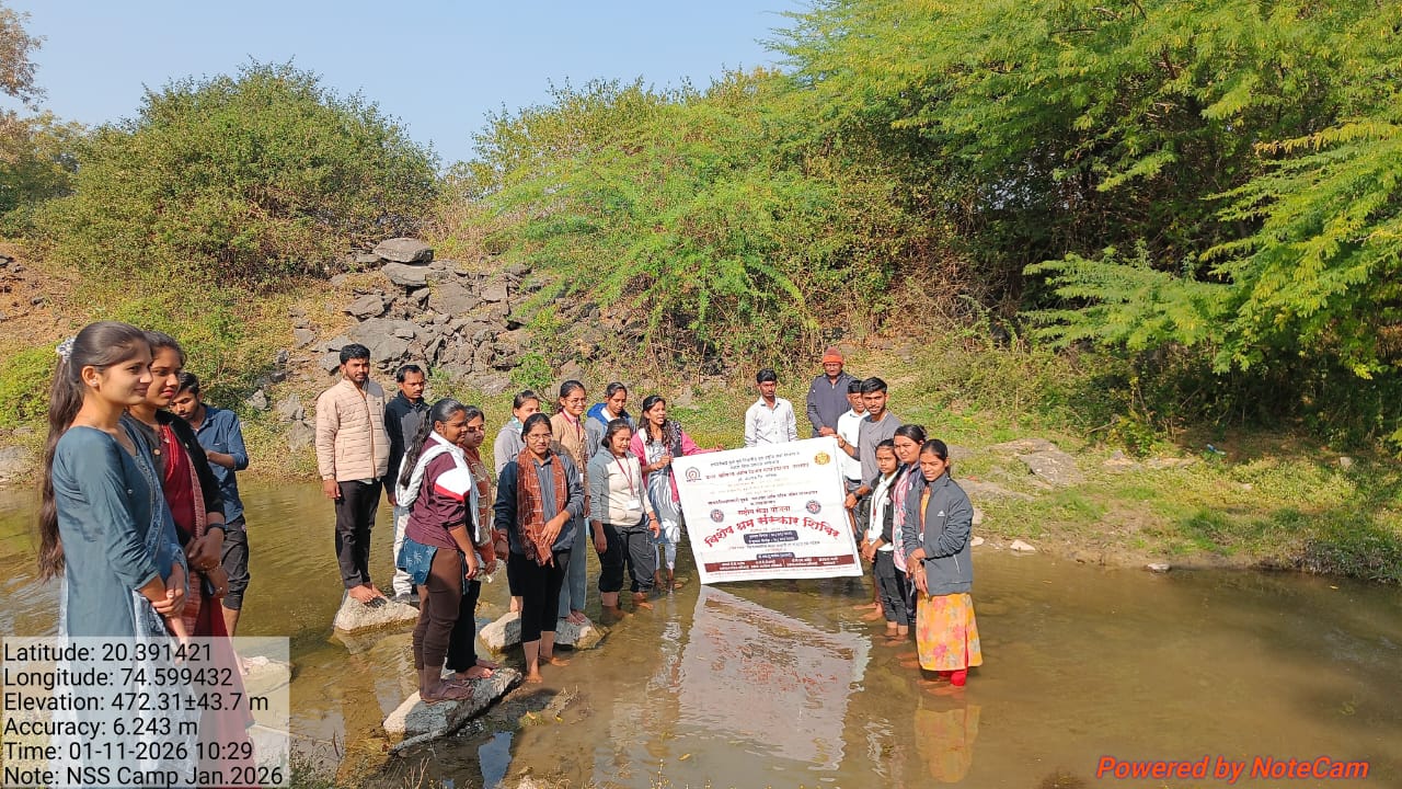 वाखारी (प्रतिनिधी ) मविप्र समाजाचे, कला, वाणिज्य व विज्ञान महाविद्यालय नांदगाव व सावित्रीबाई फुले पुणे विद्यापीठ यांच्या संयुक्त विद्यमाने वाखारी येथे राष्ट्रीय सेवा योजनेचे विशेष श्रम संस्कार शिबीर दिनांक ८/१/२०२६ ते १४/१/२०२६ पर्यंत होत आहे. चौथ्या दिवशी पहिल्या सत्रात रा.से.यो.चे कार्यक्रम अधिकारी डॉ. बी.एम. आहिरे यांच्या मार्गदर्शनाखाली सकाळी स्वयंसेवकांनी वाखारी जिल्हा परिषद शाळेचे परिसर स्वच्छ केले. गावातील फारवर्षापूर्वी येथे वाघ मेला होता म्हणून त्या वाघांचे नाव असलेल्या गावाजवळून वाहनाऱ्या वाघ नदीवर स्वयंसेवकांनी सिमेंटच्या गोण्यामध्ये वाळू ,दगड ,मातीच्या साह्याने बंधारा बांधला त्यामुळे शेजारच्या शेतकऱ्याच्या विहिरीच्या पाणीपातळीत वाढ होण्यास मदत होणार आहे