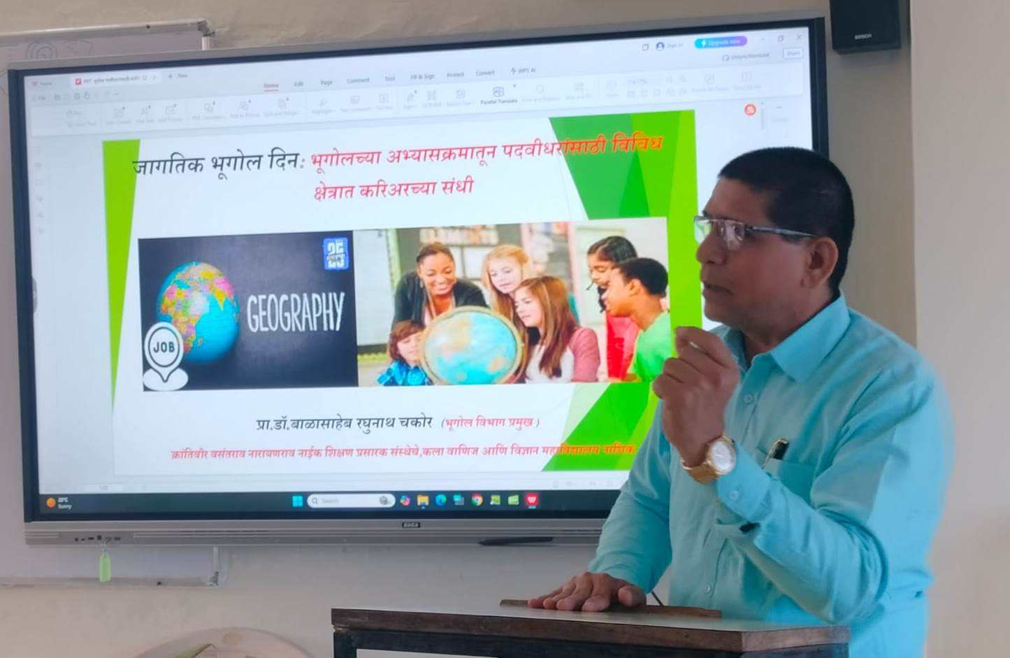 कार्यक्रमाच्या अध्यक्षस्थानी प्राचार्य प्रा.डॉ.आदिनाथ मोरे होते तर प्रमुख वक्ते म्हणून नाशिक येथील के.व्ही.एन.नाईक महाविद्यालयाचे प्रा.डॉ.बाळासाहेब चकोर होते. त्यांनी भूगोल विषयातील करिअरच्या संधी या विषयावर विद्यार्थ्यांना सखोल मार्गदर्शन केले. भूगोल विषय हा केवळ नकाशे, नद्या व पर्वत इ. चा अभ्यास नसून मानव, पर्यावरण, संसाधने, तंत्रज्ञान यांचा एकत्रित अभ्यास करणारे आधुनिक अंतरविद्याशाखीय शास्त्र आहे. भूगोलशास्त्रातून विद्यार्थ्यांसाठी उज्वल करिअरच्या संधी उपलब्ध असून विद्यार्थ्यांनी आधुनिक बदलत्या युगाशी जुळवून घेणे आवश्यक असल्याचे प्रतिपादन त्यांनी केले. भूगोल दिनानिमित्त पोस्टर प्रदर्शनाचे देखील आयोजन करण्यात आले. या प्रदर्शनात विद्यार्थ्यांनी उत्स्फूर्तपणे सहभाग नोंदवत भौगोलिक विषयावर विविध पोस्टर्स तयार केले. कार्यक्रमाचे सूत्रसंचालन तेजस्विनी शेळके हिने केले, प्रास्ताविक प्रा.डॉ.सोमनाथ आरोटे यांनी केले तर आभार गायत्री पोटे हिने मानले.