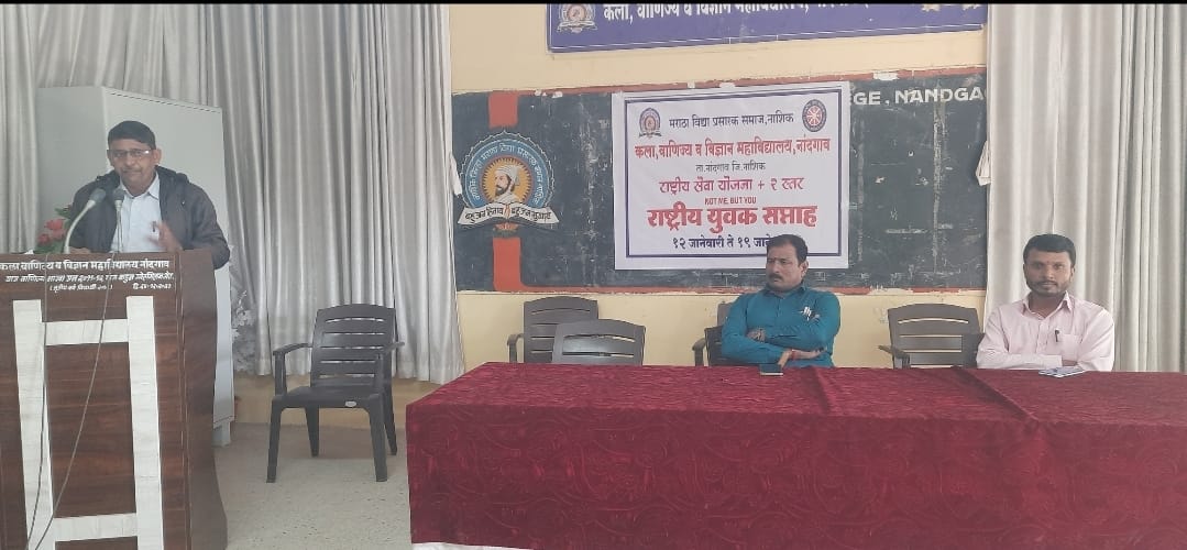 नांदगाव (प्रतिनिधी )कला, वाणिज्य व विज्ञान महाविद्यालय, नांदगाव येथे राष्ट्रीय सेवा योजना +2 स्तरच्या वतीने आयोजित ‘राष्ट्रीय युवक सप्ताह’ अंतर्गत प्रा.गोकुळ बोरसे यांचे ‘व्यक्तिमत्व विकास व युवक प्रबोधन’ या विषयावर व्याख्यान संपन्न झाले.सदर प्रसंगी महाविद्यालयाचे प्राचार्य डॉ.एन.यु.पाटील मंचावर उपस्थित होते.