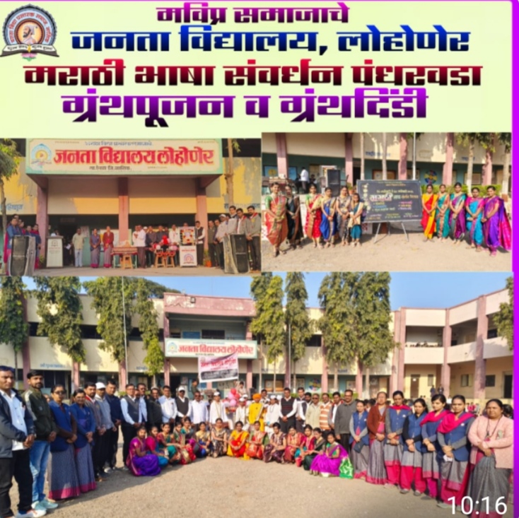 लोहोणेर-:(प्रतिनिधी )येथील मराठा विद्या प्रसारक समाज संस्थेच्या जनता विद्यालयात मराठी भाषा संवर्धन पंधरवड्याचा शुभारंभ ग्रंथपूजन आणि भव्य ग्रंथदिंडीने उत्साहात आणि पारंपरिक वातावरणात करण्यात आला. १४ जानेवारी ते २८ जानेवारी या कालावधीत मराठी भाषेच्या प्रचार-प्रसारासाठी विविध उपक्रम राबविण्यात येणार असल्याची माहिती मुख्याध्यापिका कल्पना शिंदे यांनी दिली. कार्यक्रमाच्या प्रास्ताविकात सांस्कृतिक समिती प्रमुख सुनिल एखंडे यांनी मराठी भाषा ही फक्त संवादाचे साधन नसून ती आपल्या संस्कृतीची,परंपरेची आणि ओळखीची मानबिंदू असल्याचे सांगितले. मराठी भाषेबद्दल अभिमान जागवणे आणि विद्यार्थ्यांमध्ये वाचन संस्कृती वाढवणे हा या पंधरवड्याचा मुख्य हेतू असल्याचे त्यांनी स्पष्ट केले.पंधरवड्यात वाचनप्रेरणा उपक्रम,कविता वाचन,निबंधलेखन, शब्दसंपदा वाढवा अभियान, वाचनदिंडी, कथाकथन,सामान्यज्ञान स्पर्धा अशा अनेक उपक्रमांचे आयोजन करण्यात येणार आहे.