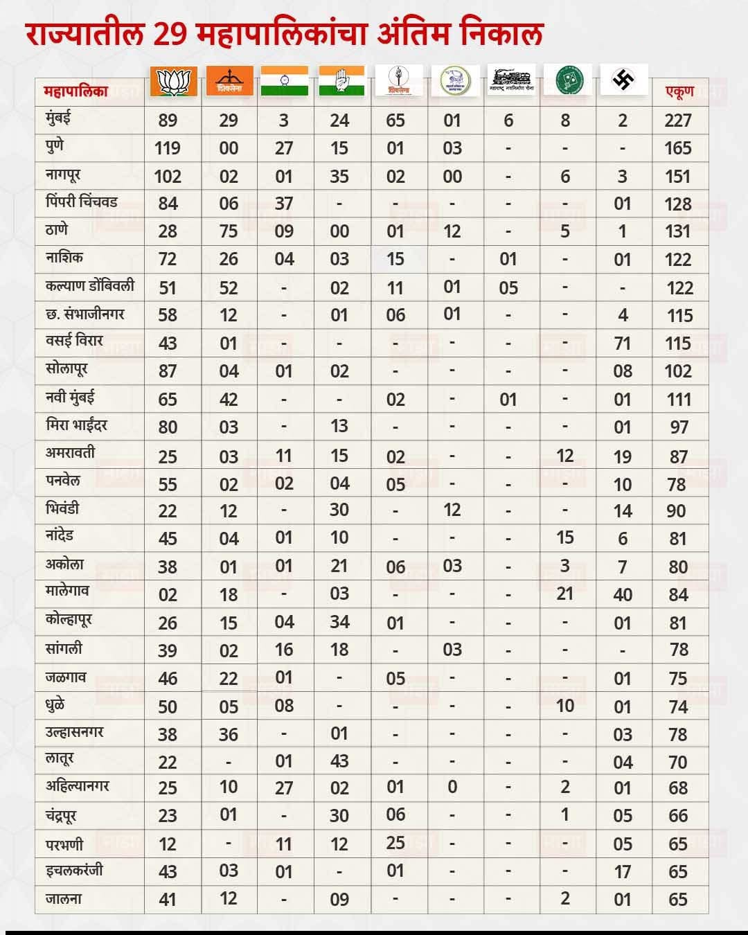 २९ शहरांचा विश्लेषणात्मक आढावा*राज्यातील २९ महानगरपालिकांच्या अंतिम निकालांचा हा तक्ता केवळ आकड्यांची बेरीज नसून, तो महाराष्ट्राच्या लोकशाही मनोवृत्तीचा सखोल, बहुआयामी आणि वास्तवदर्शी आरसा आहे. प्रत्येक शहरातील निकाल त्या त्या शहराच्या सामाजिक, आर्थिक, सांस्कृतिक आणि राजकीय वास्तवाचा साक्षीदार ठरतो. मतदारांनी दिलेले कौल हे केवळ पक्षांना नाही, तर त्यांच्या कामगिरीला, धोरणांना, नैतिकतेला आणि भविष्यातील अपेक्षांना दिलेले उत्तर आहे. या निवडणुकांमधील मतदार सहभाग लोकशाहीवरील विश्वास दर्शवतो, तर काही ठिकाणी जाणवणारी उदासीनता लोकशाहीतील ‘मतदान थकवा’, निवडणूक खर्चाविषयीची अस्वस्थता आणि अपेक्षा–वास्तव यांतील दरीही अधोरेखित करते.या निकालांकडे पाहताना महानगरपालिकांच्या आर्थिक व्यवस्थापनाची गंभीर चौकशी करणे अपरिहार्य ठरते. महसूल स्रोतांची मर्यादा, मालमत्ता कराची अंमलबजावणी, वाढता कर्जभार, प्रकल्प खर्च यामुळे स्थानिक स्वराज्य संस्थांसमोर आर्थिक शिस्तीचे आव्हान उभे आहे. स्थानिक स्वराज्य संस्थांच्या अधिकारांवरील मर्यादा आणि राज्य शासनावर वाढते अवलंबित्व यामुळे स्वायत्त स्थानिक प्रशासनाची संकल्पनाच प्रश्नांकित होत असल्याचे दिसते. नगरसेवकांच्या वैयक्तिक जबाबदारी व कार्यक्षमतेचा प्रश्न मतदारांनी अप्रत्यक्षपणे अधोरेखित केला आहे.मुंबई महानगरपालिकेचा निकाल पाहता बहुरंगी राजकीय वास्तव प्रकर्षाने समोर येते. विविध पक्षांना मिळालेला प्रतिसाद हा मुंबईसारख्या महानगरातील सामाजिक, आर्थिक व वर्गीय वैविध्याचे प्रतिबिंब आहे. उच्चभ्रू वस्ती, मध्यमवर्गीय परिसर आणि झोपडपट्टी भाग—या सर्व स्तरांतील मतदारांच्या अपेक्षा भिन्न असून त्याचा ठसा निकालांत स्पष्ट दिसतो. विकास, पारदर्शकता, पर्यावरणीय प्रश्न, हवामान बदल, किनारपट्टीचे संरक्षण, वाढता करभार, मूलभूत सुविधांची असमान उपलब्धता, सार्वजनिक आरोग्य व्यवस्था, सार्वजनिक जागांचे संवर्धन, पर्यावरणपूरक शाश्वत विकासाची अंमलबजावणी, शहरी नियोजनातील दीर्घकालीन दृष्टी, आणि भ्रष्टाचारविरोधी भूमिका या मुद्द्यांचा थेट प्रभाव मतदानावर दिसतो. नेतृत्व स्थानिक आहे की आयात—हा प्रश्न मतदारांनी ठामपणे उपस्थित केला आहे.पुणे, नागपूर आणि पिंपरी-चिंचवडसारख्या औद्योगिक व शैक्षणिक केंद्रांमध्ये मतदारांनी तुलनेने स्पष्ट आणि विवेकी भूमिका घेतलेली दिसते. पुण्यातील निकाल सुशिक्षित मतदारवर्गाची चिकित्सक वृत्ती दर्शवतो, जिथे धोरण, नियोजन, ई-गव्हर्नन्स, शिक्षण व्यवस्था, महापालिका शाळांची गुणवत्ता, सार्वजनिक शिक्षणावर खर्चाचा प्राधान्यक्रम आणि सांस्कृतिक ओळख महत्त्वाची ठरली आहे. नागपूरमध्ये सत्तेचा स