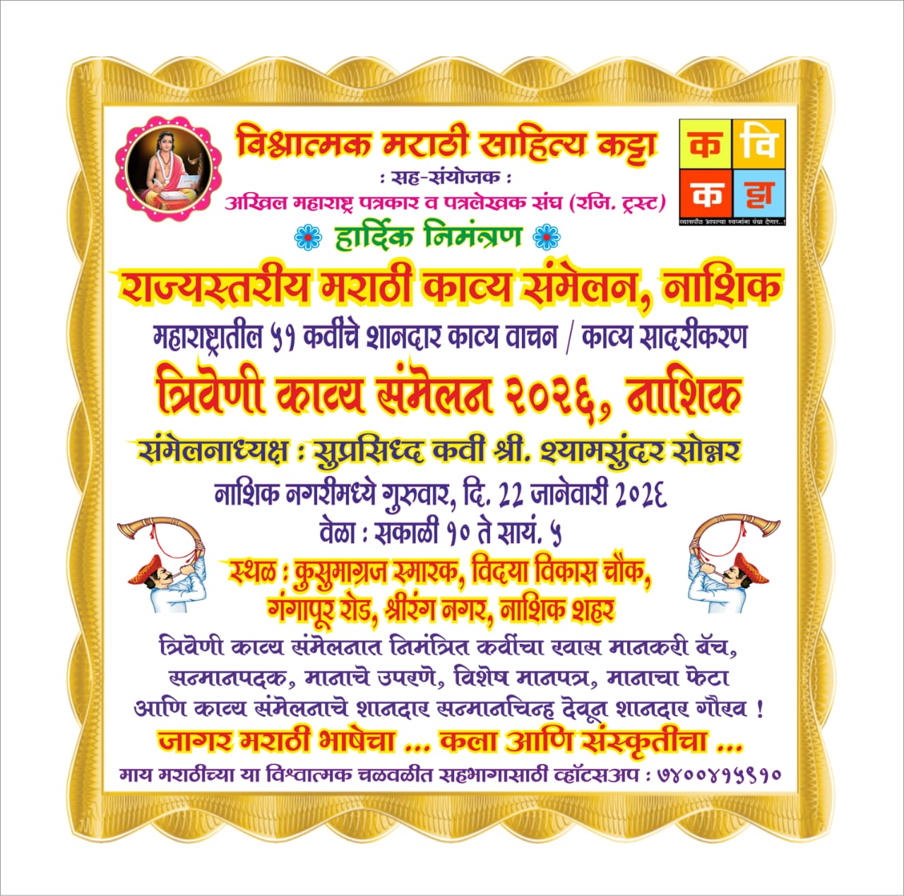 नाशिक ( प्रतिनिधी ) विश्वात्मक मराठी साहित्य कट्टा या मंचाच्या मासिक शाखेच्या वतीने गुरुवार दिनांक 22 जानेवारी 2026 रोजी सकाळी १०.०० ते सायं.५ .०० यावेळी नाशिक जिल्ह्यात स्तरीय समरसता साहित्य संमेलनाचे आयोजन कुसुमाग्रज स्मारकाच्या विशाखा सभागृहात करण्यात आले आहे. या समरसता संमेलनाच्या अध्यक्षपदी सुप्रसिद्ध कीर्तनकार आणि कवी ह भ प श्री शामसुंदर महाराज सोन्नर आळंदीकर यांची निवड करण्यात आली आहे.