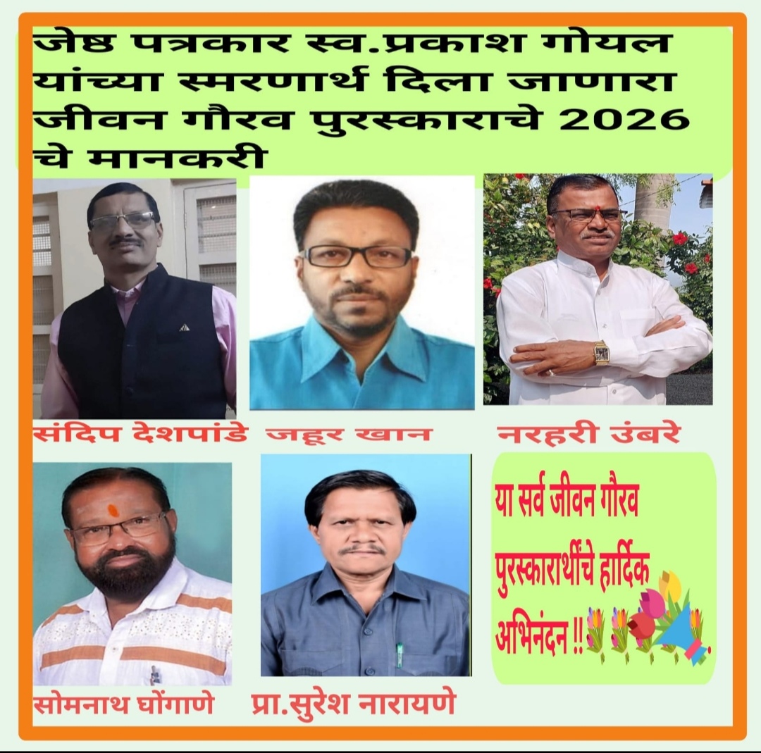 साप्ताहिक मनमाड ठिणगीचे संस्थापक संपादक, ज्येष्ठ पत्रकार (स्व.) प्रकाश गोयल यांच्या स्मरणार्थ गोयल परिवाराच्या वतीने दिल्या जाणाऱ्या ‘चौथास्तंभ जीवनगौरव पुरस्कारासाठी’ यंदा वरील पाचही ज्येष्ठ पत्रकारांची निवड करण्यात आली आहे. सन्मानचिन्ह, मानपत्र, महावस्त्र व पुष्पगुच्छ देऊन मान्यवरांच्या हस्ते त्यांचा गौरव करण्यात येणार आहे.