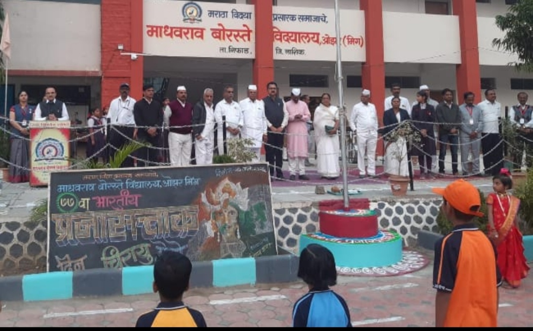 ओझर: दि. 26 (वार्ताहर) येथील माधवराव बोरस्ते विद्यालयात प्रजासत्ताक दिनानिमित्त राष्ट्रीय ध्वजाचे ध्वजारोहण ‘मविप्र’ महिला संचालिका शोभाताई बोरस्ते यांचेहस्ते, तर स्काऊटचे ध्वजारोहण सेवक संचालक डॉ एस के शिंदे यांचे हस्ते झाले. प्रास्ताविक मुख्याध्यापक सोपान वाटपाडे यांनी केले. मविप्र सेवक संचालक डॉ एस के शिंदे म्हणाले, भारत जगातील एकमेव बलाढ्य लोकशाही देश असून गौरवशाली भारताचे स्वप्न साकार करण्यासाठी सर्वांनी देशासाठी संघटित होण्याची गरज व्यक्त केली. यावेळी मुख्याध्यापक सोपान वाटपाडे यांच्या अथक प्रयत्नातून स्थापन झालेल्या एनसीसी पथकाने संचलन करून राष्ट्रीय ध्वजास मानवंदना दिली. पथकास शिक्षक नरेंद्र डेरले शितल हंडोरे यांनी मार्गदर्शन केले. अध्यक्षीय भाषणात शोभा बोरस्ते यांनी प्रजासत्ताक दिनाचे महत्त्व स्पष्ट केले.