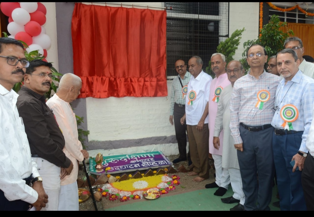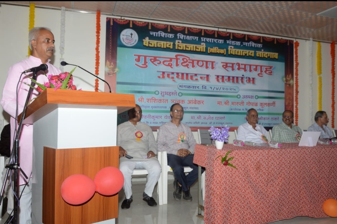 नांदगाव.(प्रतिनिधी) :- येथील वैजनाथ जिजाजी (तांञिक) विद्यालयात मंगळवार दि.१ एप्रिल २०२५ रोजी असलेल्या १०६ व्या शाळेच्या ‘वर्धापन’ दिनी नाशिक शिक्षण प्रसारक मंडळातर्फे ‘गुरूदक्षिणा’ सभागृहाचे मोठ्या थाटात उदघाटन करण्यात आले. विद्यालयाचे माजी मुख्याध्यापक गुरूवर्य श्री. शशिकांत आंबेकर ह्यांच्या सेवानिवृती वर्षात बुधवार दि. १६ आॕक्टोबर २००६ रोजी तत्कालीन लोकसभा अध्यक्ष कै. मनोहर जोशी यांच्या शुभहस्ते भूमीपुजन झालेल्या ‘गुरूदक्षिणा’ सभागृहाचे आज अठरा वर्षानंतर शाळेच्या वर्धापन दिनी थाटामाटात उदघाटन करण्यात आले. ह्यावेळी संस्थेचे कार्याध्यक्ष मान.श्री. मारूतीराव कुलकर्णी, डाॕ.श्री.भरत केळकर (अध्यक्ष, सर्वसाधारण सभा) मान.श्री. श्रीपादजी देशपांडे (उपाध्यक्ष, सर्वसाधारण सभा), मान.श्री.अश्विनीकुमार येवला (संस्था सचिव), मान.श्री.मिलींद कचोळे (संस्था सहसचिव), मान.श्री. सारंगजी इंगळे (अध्यक्ष,अॕकेडमिक बोर्ड), मान.श्री.श्रीकृष्ण रत्नपारखी( दादासाहेब) आदी मान्यवरांच्या उपस्थितीत गुरूवर्य मान.श्री.शशिकांत आंबेकर ह्यांच्या शुभहस्ते फित कापत व श्रीफळ वाढवत ‘गुरूदक्षिणा’ सभागृहाचे उदघाटन करण्यात आले.