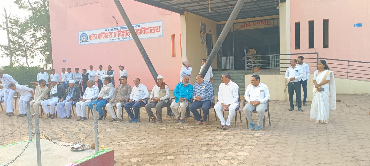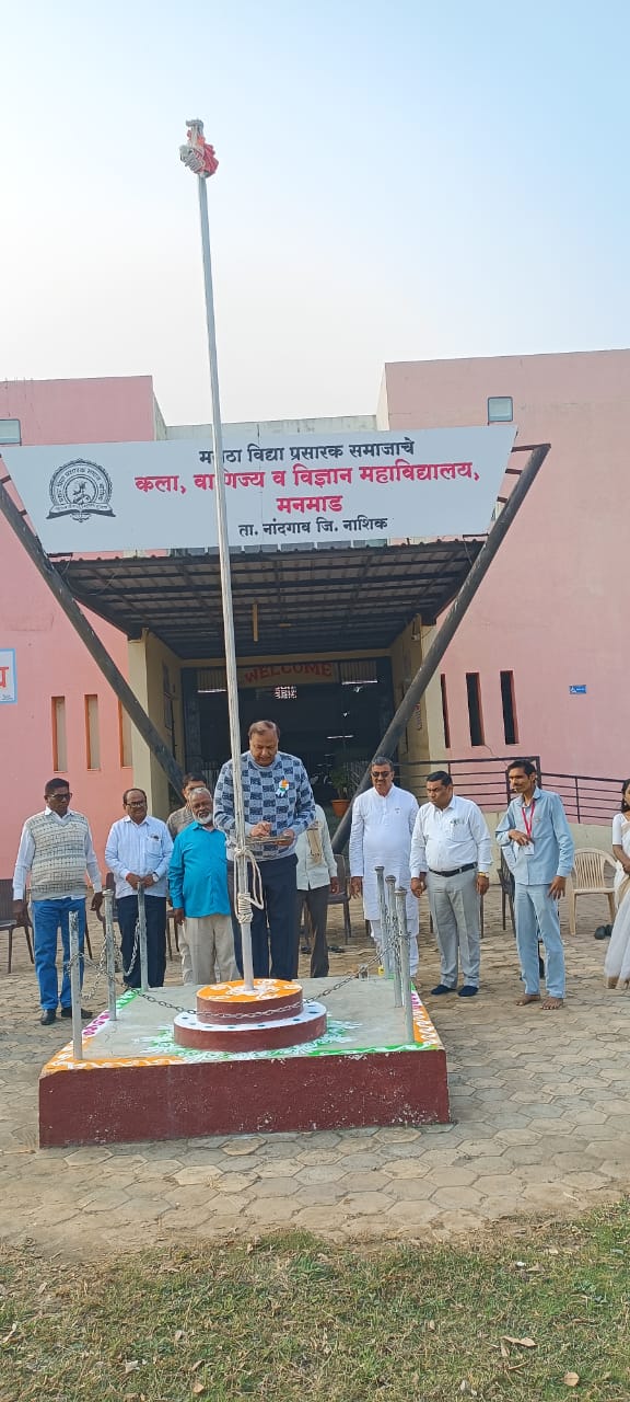 मनमाड ( प्रतिनिधी ) मराठा विद्या प्रसारक समाजाचे कला, वाणिज्य आणि विज्ञान महाविद्यालय, मनमाड आदर्श इंग्लिश मीडियम स्कूल, मनमाड आणि अभिनव बाल विकास मंदिर, मनमाड यांच्या संयुक्त विद्यमाने प्रजासत्ताक दिन उत्साहाच्या वातावरणात साजरा करण्यात आला. या प्रजासत्ताक दिनानिमित्त ध्वजाचे ध्वजारोहण भाग्यलक्ष्मी पतसंस्थेचे संचालक श्री. राजेंद्र देशमुख व शालेय व्यवस्थापन समितीचे सदस्य व माजी नगरसेवक श्री. रवींद्र घोडेस्वार यांच्या हस्ते करण्यात आले. सदर कार्यक्रमास अध्यक्ष म्हणून महाविद्यालय विकास समितीचे अध्यक्ष श्री बाळासाहेब साळुंखे हे होते.