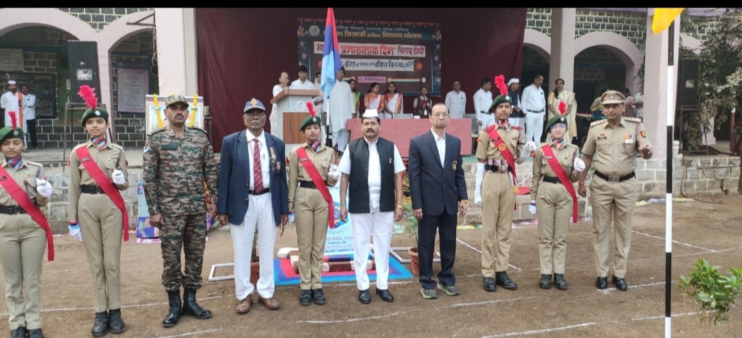 विद्यार्थ्यांनी मोठ्या जोशासह तालासुरात म्हटलेल्या राष्ट्रगीत, महाराष्ट्र राज्यगीत आणि ध्वजगीताने शाळेतील एकूणच वातावरण देशभक्तीमय झाले नसते तर नवलंच ..!!* व्यासपीठावर प्रमुख पाहूणे भारतीय सैन्यदलात आसाम येथे कार्यरत असलेले सैनिक श्री. गोविंद सदगीर , कार्यक्रमाचे अध्यक्ष श्री. संजीवजी धामणे मा. मुख्याध्यापक श्री. लक्ष्मीकांत ठाकरे , उपमुख्याध्यापक डॉ. श्री. नांदुरकर , माजी NCC शिक्षक श्री. साळुंके,ज्येष्ठ शिक्षक श्री. गुलाब मोरे ,पा. शि. संघ सदस्य श्रीमती पूनम लोहाडे, श्री. अनिल थोरे, श्रीमती प्राची सानप, श्रीमती कुंभार्डे, श्रीमती कुमावत तसेच टी. एम. बोर्ड सदस्य गुलाब पाटील, भास्कर मधे, श्रीम रुपाली झोडगेकर , उपस्थित होते सर्व मान्यवरांसह उपस्थित विद्यार्थ्यांनी ध्वज प्रतिज्ञा म्हणत संकल्पपूर्वक निर्धाराचे स्मरणही केले.