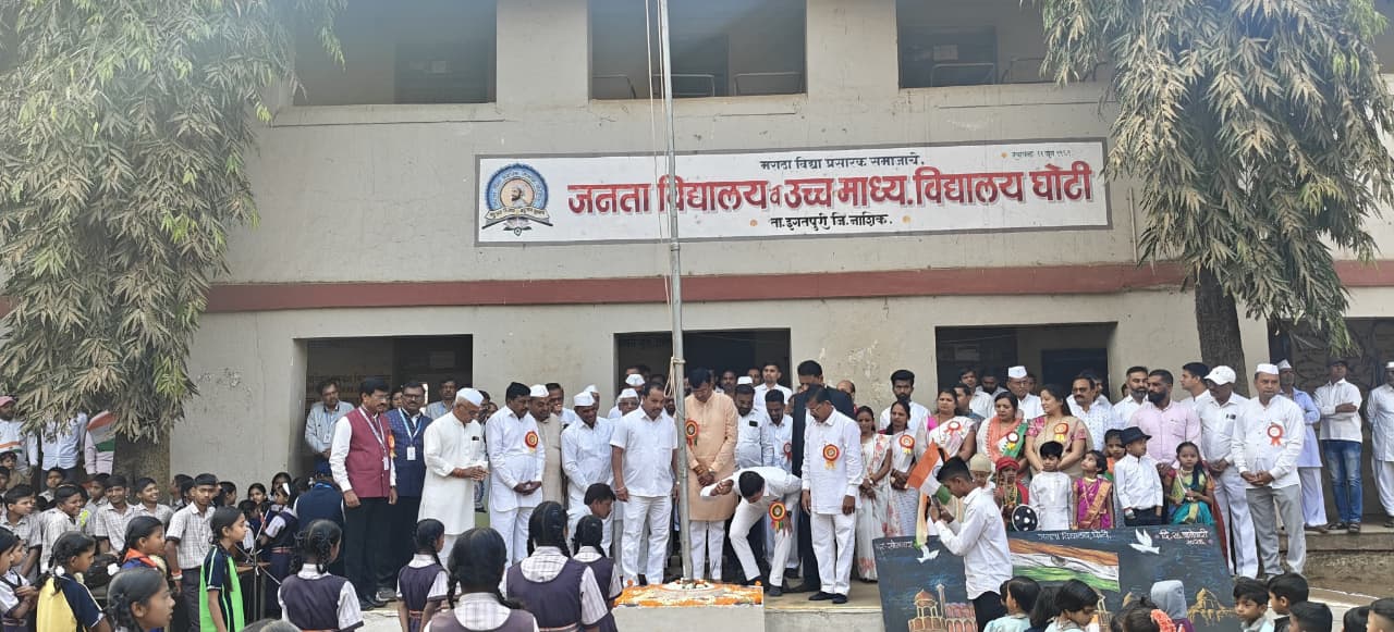 सिन्नर प्रतिनिधी:- घोटी येथील जनता विद्यालय व ज्युनिअर कॉलेज तसेच अभिनव बाल विकास मंदिर मध्ये प्रजासत्ताकदिन उत्साहात साजरा करण्यात आला. ढोल ताशाच्या गजरात विद्यार्थ्यांनी घोषणा देत गावातून प्रभात फेरी काढली.राष्ट्रीय ध्वजाचे ध्वजारोहण कार्यक्रमाचे अध्यक्ष व मराठा विद्या प्रसारक समाज संस्थेचे तालुका संचालक ॲड. संदीप भाऊ गुळवे यांच्या हस्ते करण्यात आले. ध्वजपूजन शालेय समितीचे अध्यक्ष मनोज भाऊ जाधव व उच्च माध्यमिक समितीचे अध्यक्ष राजेंद्र आप्पा जाधव यांच्या हस्ते करण्यात आले .व्यासपीठावर माजी आमदार शिवराम झोले,पंचायत समितीचे माजी सदस्य अण्णा पवार, पोलिस निरीक्षक विजय शिंदे,उपनिरीक्षक श्री.भिंगरदे, शालेय समितीचे सदस्य गणपत राव,सागर हांडे,योगेश जाधव,नरेंद्र मेधने,दीपा कंदकुरीवार ,सुनीता सिंघल,स्वातीताई कडू,वैशाली गोसावी,पालक-शिक्षक संघाचे उपाध्यक्ष गोरक्षनाथ गव्हाणे, माता-पालक संघाच्या उपाध्यक्षा सुनिता वाघचौरे,दत्तात्रय भोर,रामदास भोर,केंद्रप्रमुख राजेश खैरनार,प्राचार्य नितीन भामरे, उपमुख्याध्यापक उल्हास पवार , पर्यवेक्षक हिरामण चौधरी ,मुख्यलिपीक भाऊसाहेब रणशेवरे आदी मान्यवर उपस्थित होते.विद्यार्थ्यांसह उपस्थित मान्यवर व पालकांना संविधान प्रतिज्ञा श्रीमती एम.आर.सोनवणे यांनी दिली . गायत्री सूर्यवंशी यांनी विद्यार्थ्यांसह पालकांना कॉपीमुक्त अभियान शपथ तसेच असाक्षर मुक्त गाव शपथ / साक्षरतेची शपथ दिली. संगीतशिक्षक प्रकाश तांबे यांच्या मार्गदर्शनाखाली विद्यार्थ्यांनी राष्ट्रगीत,ध्वजगीत, राज्यगीत व देशभक्तीपर गीते सादर केली. क्रीडा शिक्षिका वंदना जाधव यांच्या मार्गदर्शनाखाली विद्यार्थ्यांनी देशभक्तीपर उत्कृष्ट संगीत कवायत सादर केली. विद्यार्थ्यांनी देशभक्तीपर गीतावर आधारित सांस्कृतिक कार्यक्रम सादर केले.