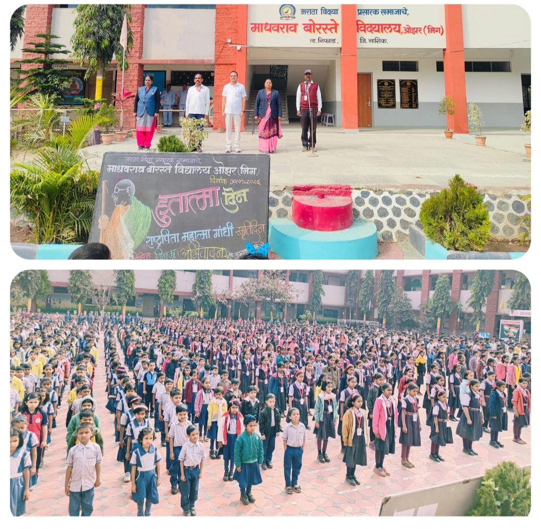 ओझर: दि. 30( वार्ताहर)देशाच्या स्वातंत्र्यासाठी प्राणार्पण केलेल्या हुतात्म्यांच्या स्मरणार्थ आदर व्यक्त करण्यासाठी ओझर येथील माधवराव बोरस्ते विद्यालयात महात्मा गांधींच्या प्रतिमेचे पूजन करून सकाळी ठीक अकरा वाजता दोन मिनिटे मौन पाळून हुतात्म्यांना आदरांजली वाहण्यात आली. याप्रसंगी विद्यालयाचे मुख्याध्यापक सोपान वाटपाडे अध्यक्षस्थानी होते. व्यासपीठावर उपमुख्याध्यापक सतीश केदार पर्यवेक्षक दशरथ शिंदे अभिनवच्या मुख्याध्यापिका वनिता शिरसाठ क्रीडाशिक्षक प्रभाकर लवांड उज्वला जाधव मनोरमा सोमवंशी सर्व शिक्षक शिक्षकेतर कर्मचारी पालक ग्रामस्थ व विद्यार्थी बहुसंख्येने उपस्थित होते. फलक लेखन कलाशिक्षिका सविता पवार यांनी केले. कार्यक्रमास सर्व शिक्षक शिक्षकेतर कर्मचारी विद्यार्थी उपस्थित होते. याप्रसंगी अतिशय गांभीर्याने हुतात्मा दिनानिमित्त मौन पाळण्यात आले.