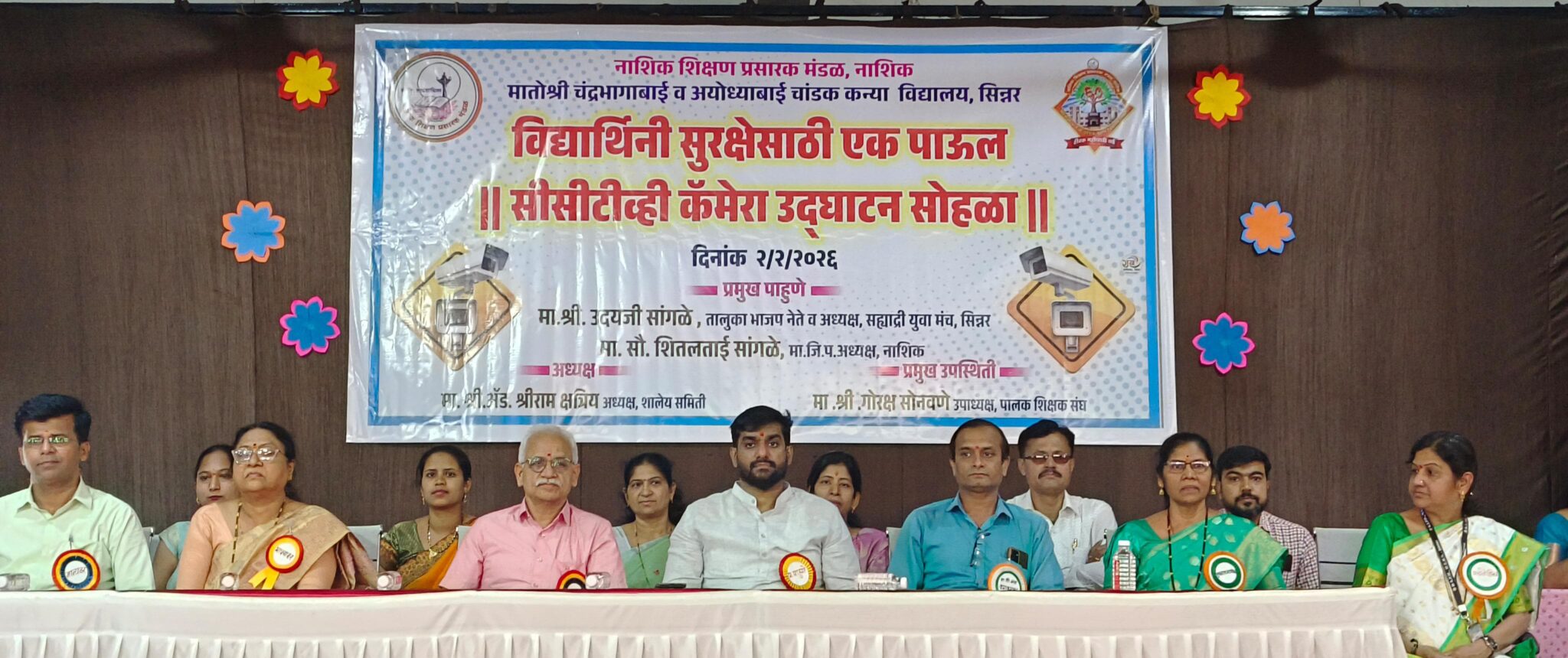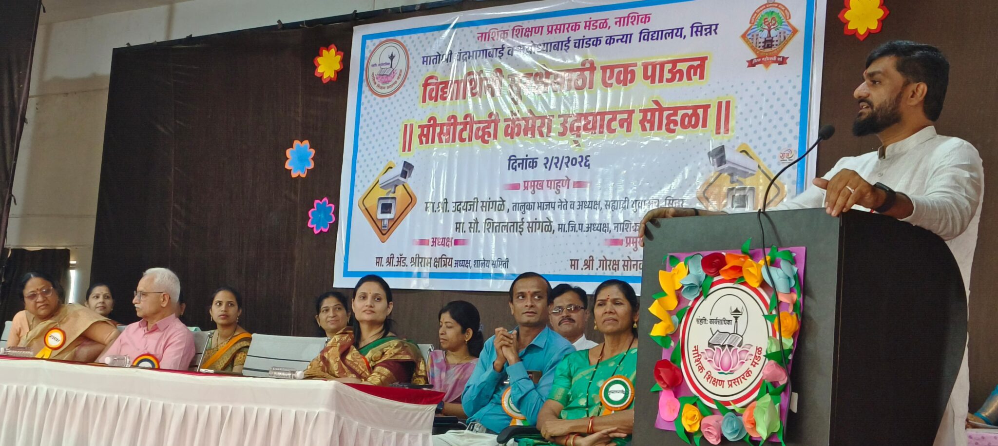 सिन्नर- (परतिनिधी ) येथील चांडक कन्या विद्यालयात विद्यार्थिनींच्या सुरक्षिततेसाठी उदयजी सांगळे व शितलताई सांगळे यांच्या उदार दातृत्वातून बसविण्यात आलेल्या सीसीटीव्ही कॅमेऱ्यांचा उद्घाटन सोहळा आयोजित करण्यात आला होता.या कार्यक्रमासाठी प्रमुख पाहुणे म्हणून सिन्नर तालुका भाजप नेते व सह्याद्री युवा मंच,सिन्नर चे अध्यक्ष उदयजी सांगळे तसेच माजी नाशिक जिल्हा परिषद अध्यक्षा शितलताई सांगळे उपस्थित होते. कार्यक्रमाच्या अध्यक्षस्थानी शाळेचे शालेय समिती अध्यक्ष ॲड.श्रीराम क्षत्रिय होते.