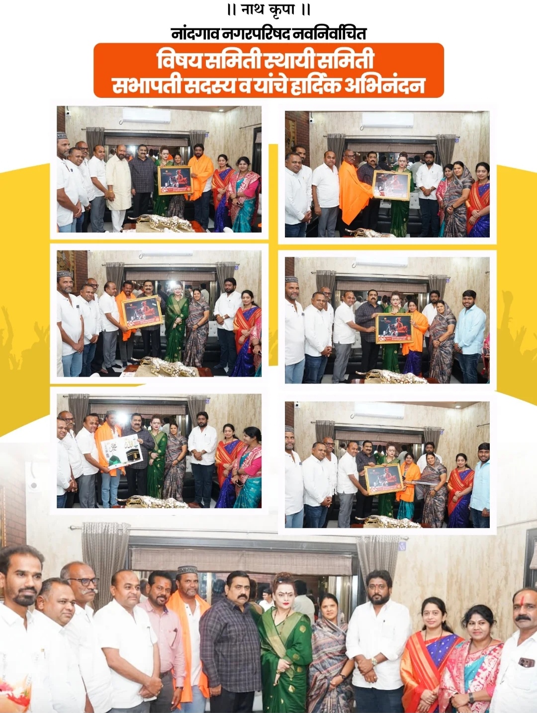 या नंतर नवनिर्वाचित सभापती व सदस्यांनी आमदार सुहास कांदे व समृध्दी बँकेच्या अध्यक्षा अंजुमताई कांदे यांच्या निवासस्थानी भेट घेतली. यावेळी नवनिर्वाचित सभापती व सदस्यांचा सत्कार करण्यात आला. व नगरपरिषद विषय समितीच्या सभापती व सदस्यांनी जनतेची कामे करावी अशी अपेक्षा आमदार सुहास अण्णा कांदे यांनी नवनिर्वाचित विषय समिती सभापती व सदस्यांकडे व्यक्त केली.