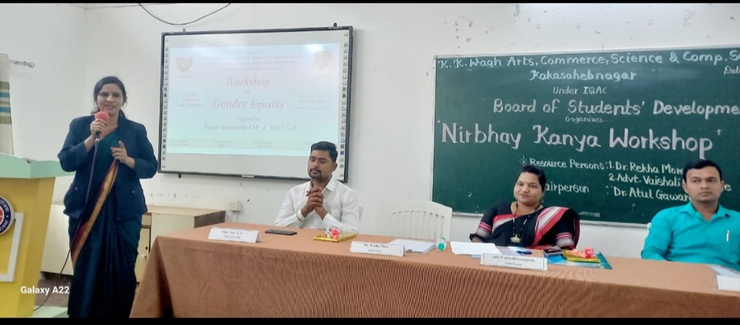 के. के. वाघ कला, वाणिज्य, विज्ञान व संगणक विज्ञान महाविद्यालय काकासाहेबनगर येथे विद्यार्थी विकास मंडळाच्या वतीने निर्भय कन्या अभियान कार्यशाळा आयोजित करण्यात आली होती. त्यावेळी डॉ. रेखा मोरे ‘स्त्री-पुरुष समानता’ या विषयावर बोलत होत्या. समाजरुपी रथ विकासाकडे दौडवायचा असेल तर पुरुषरुपी चाकाबरोबर स्त्रीरूपी चाकालाही विकासाची तेवढीच चालना मिळणे गरजेचे आहे. असे सांगत पंडिता रमाबाई आणि सावित्रीबाई फुले यांचे प्रेरणादायी कर्तृत्व विद्यार्थिंनी समोर ठेवले.