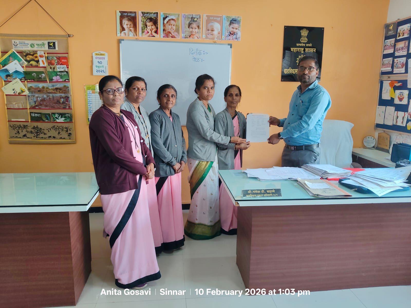 महाराष्ट्र राज्य अंगणवाडी कर्मचारी संघाच्या वतीने गुरुवारी 12 फेब्रुवारी रोजी एक दिवसाचा देशव्यापी संप व निदर्शने करण्याची निवेदन नुकतेच सिन्नरचे नायब तहसीलदार श्री . मुंदडा व बालविकास प्रकल्प अधिकारी गणेश सहाणे यांना देण्यात आले. यावेळी अंगणवाडी कर्मचारी संघटना बीट प्रमुख नलिनी पवार, अंगणवाडी कर्मचारी संघटनेच्या प्रतिनिधी अनिता गोसावी, सुनिता जायभावे, भारती जायभावे, सरला केदार आदी यावेळी उपस्थित होते.