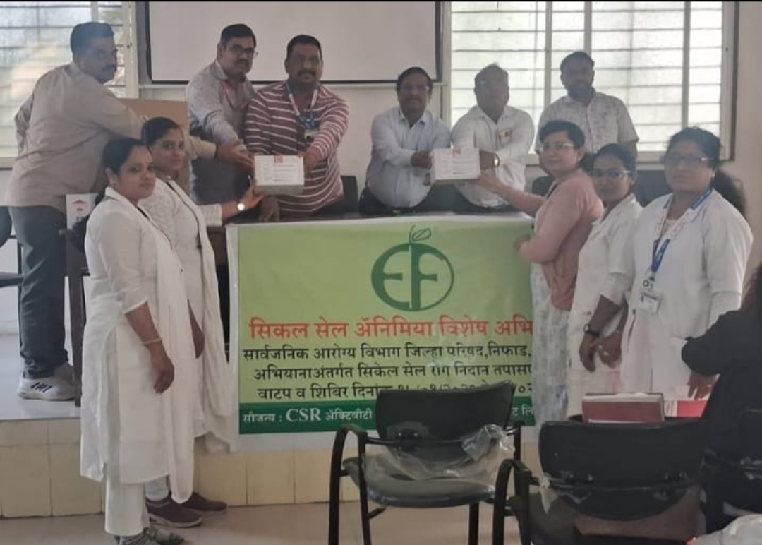 ओझर: ( वार्ताहर )निफाड तालुक्यात मिशन ऍनिमिया मुक्त भारत अंतर्गत अरुणोदय सिकल सेल अभियान अंतर्गत विंचूर येथील प्रसिद्ध exotic fruits processing कंपनीचे श्री पुरुषोत्तम बाहेती जनरल मॅनेजर, मार्केटिंगचे सेल्स मॅनेजर दीपक शिंदे यांच्याकडून सिकल सेल ॲनिमिया विशेष अभियान नियोजनासाठी निफाड तालुक्यातील सर्व प्राथमिक आरोग्य केंद्राला सिकल सेल टेस्टिंगचे 1000 किटस सीएसआर फंडातून देण्यात आले. त्यामुळे निफाड तालुक्यातील सुमारे 50000 लाभार्थीची सिकल सेल सोलूबलिंटी टेस्टिंग होणार आहे याचा सर्व सामान्य नागरिकांना निश्चित फायदा होईल असे तालुका आरोग्य अधिकारी डॉ सुजित कोशिरे म्हणाले. यावेळी तालुक्यातील डॉ निलेश चव्हाण, आरोग्य सहायक सानप नाना, संतोष नवले, प्रत्येक प्राथमिक आरोग्य केंद्रातील आरोग्य सहायक, आरोग्य सहायिका, आरोग्य सेविका, आरोग्य सेवक उपस्थित होते. यानिमित्त exotic fruits प्रोसेसिंग कंपनीचे उपस्थितानी आभार मानले.