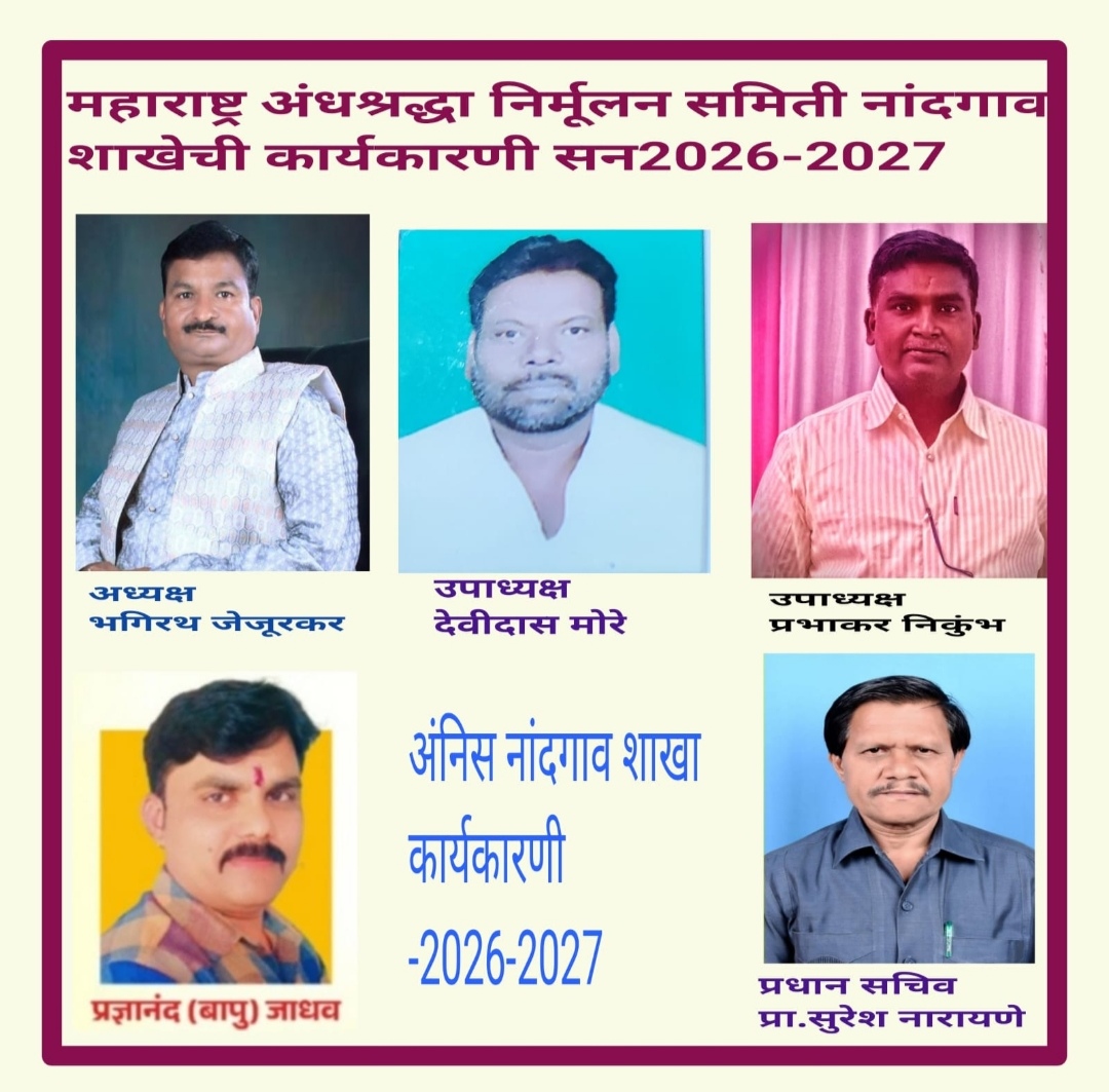 नंदगाव (प्रतिनिधी) येथील देवीदास मोरे यांच्या कार्यालयात नुकतीच महाराष्ट्र अंधश्रद्धा निर्मूलन समितीची बैठक घेण्यात आली. यावेळी नांदगाव अनिस ची नूतन कार्यकारणी जाहीर करण्यात आली. निरीक्षक म्हणून महाराष्ट्र राज्य सरचिटणीस ठकसेन गोराणे आणि नाशिक जिल्हा महाराष्ट्र अनिसचे उपाध्यक्ष डॉक्टर सुंदर झळके होते. बैठकीच्या अध्यक्षस्थानी मावळते अध्यक्ष प्रा. सुरेश नारायणे होते.